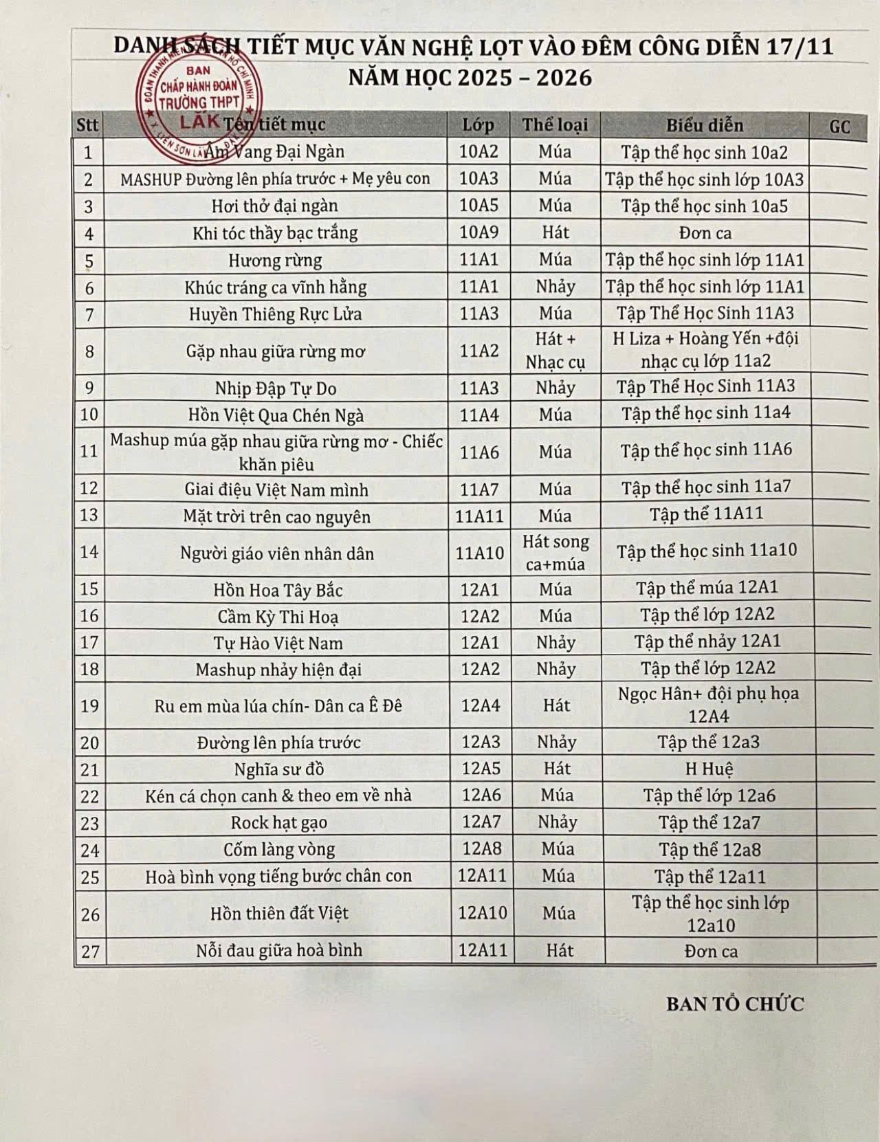 Danh sách 27 tiết mục lọt vào đêm công diễn 17/11 năm 2025 – 2026.