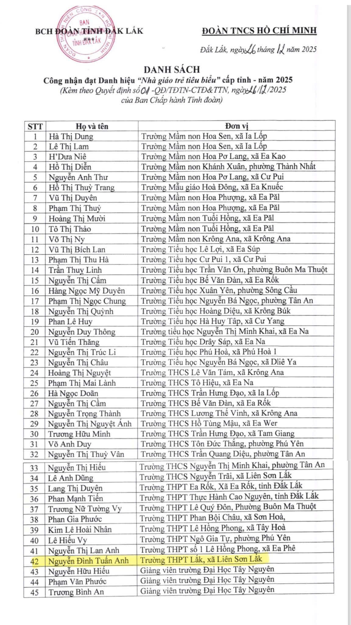 Danh sách công nhận danh hiệu “Nhà giáo trẻ tiêu biểu cấp tỉnh năm 2025” theo Quyết định số 01-QĐ/TĐTN-CTD&TTN ngày 26/12/2025.