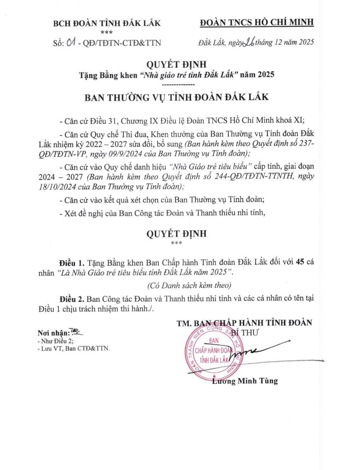 Quyết định số 01-QĐ/TĐTN-CTD&TTN (26/12/2025) – Tặng Bằng khen “Nhà giáo trẻ tiêu biểu cấp tỉnh năm 2025”.