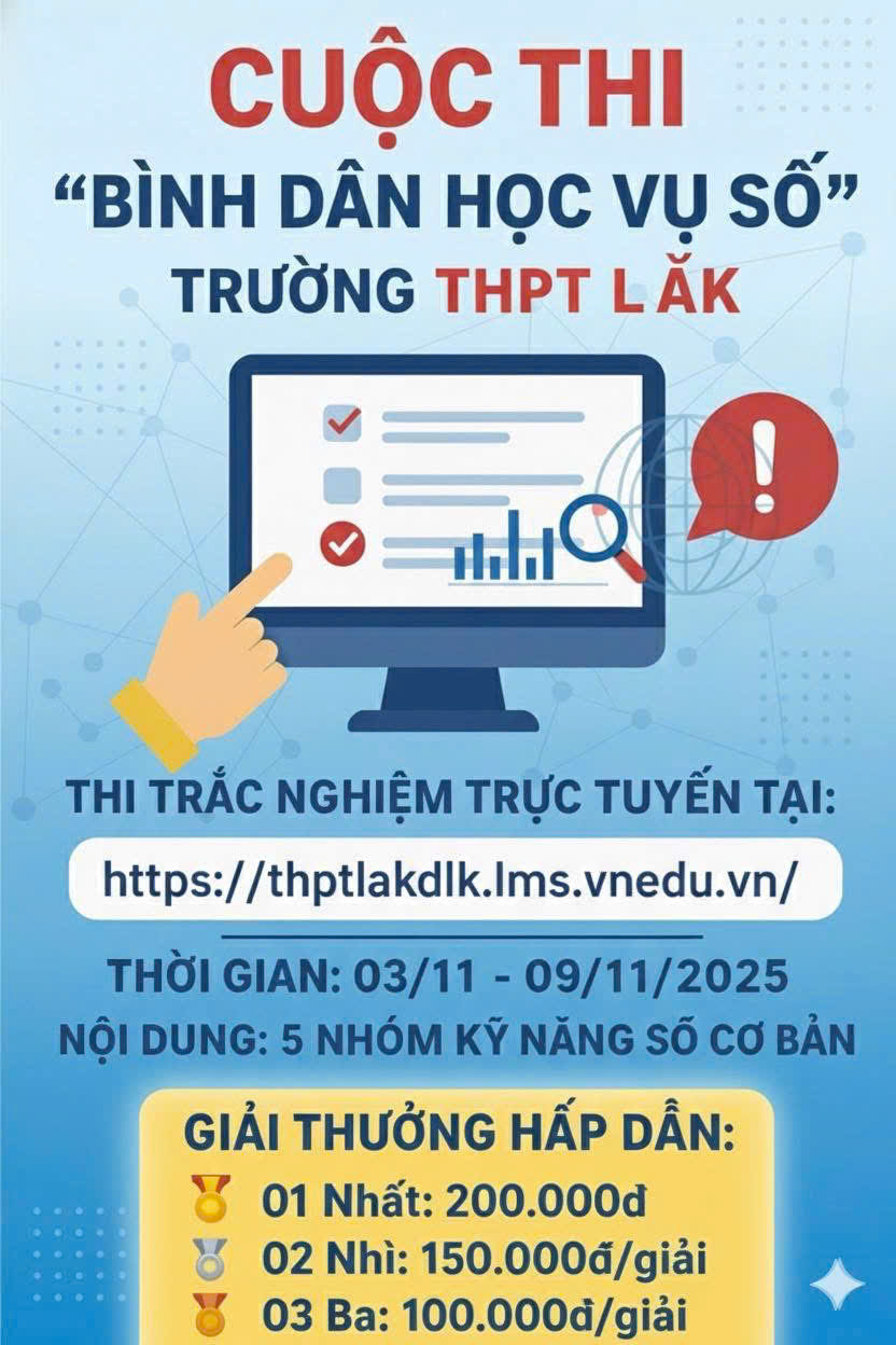 Thực hiện chỉ đạo của Sở Khoa học và Công nghệ cùng Sở Giáo dục và Đào tạo Đắk Lắk trong đợt phát động 100 ngày cao điểm phong trào “Bình dân học vụ số”, Trường THPT Lắk tổ chức Cuộc thi trắc nghiệm trực tuyến tìm hiểu về “Bình dân học vụ số” dành cho toàn thể học sinh.