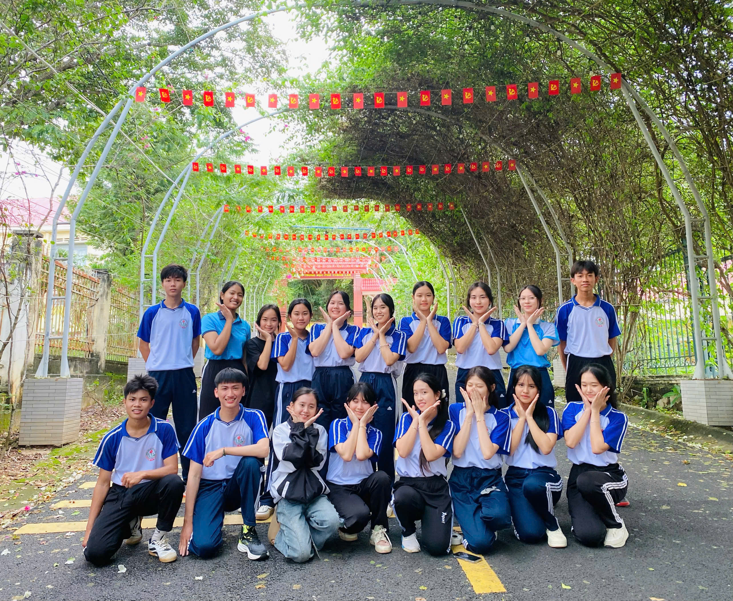 Các em học sinh chụp ảnh tại đường cờ của Trường.