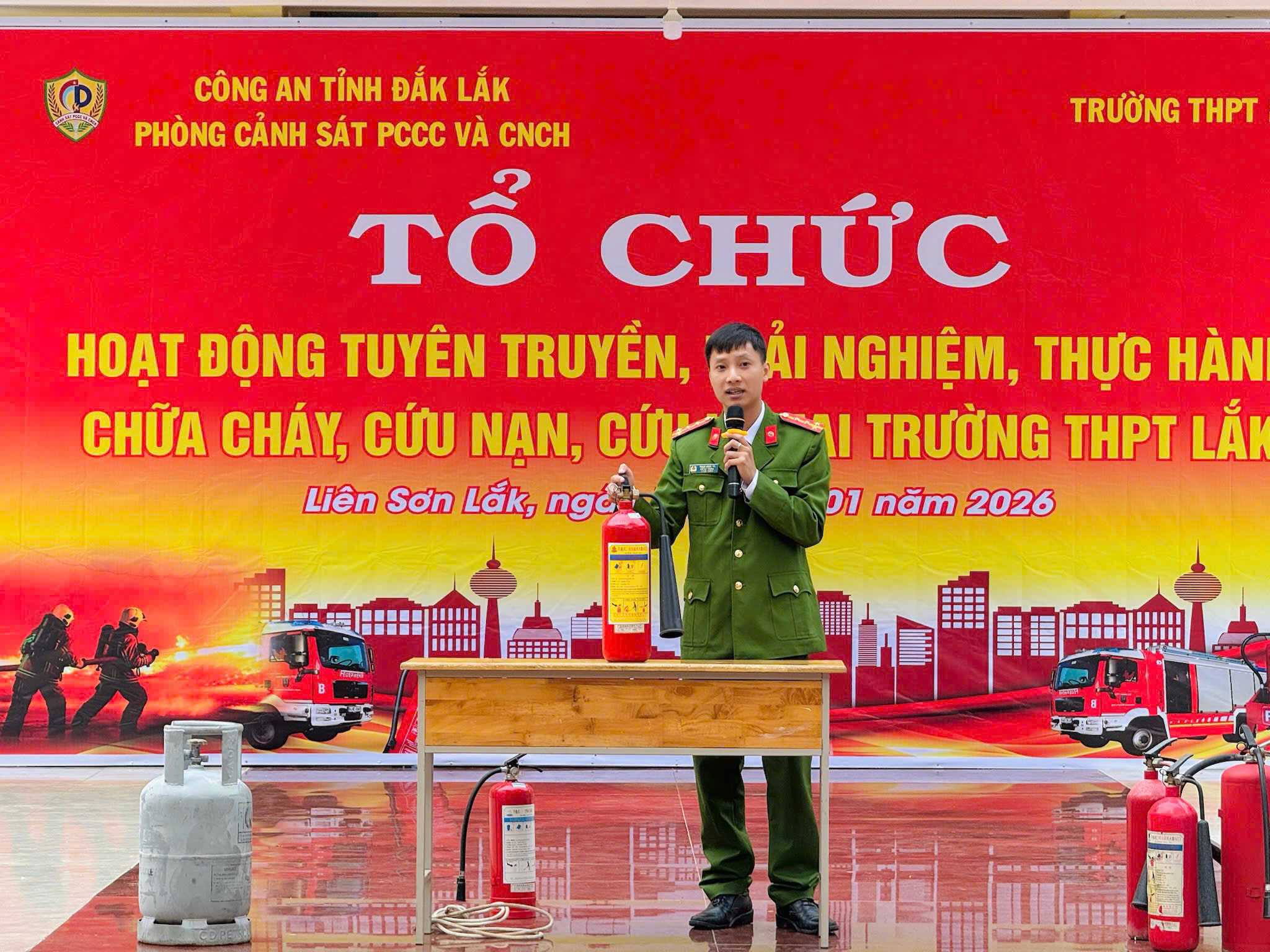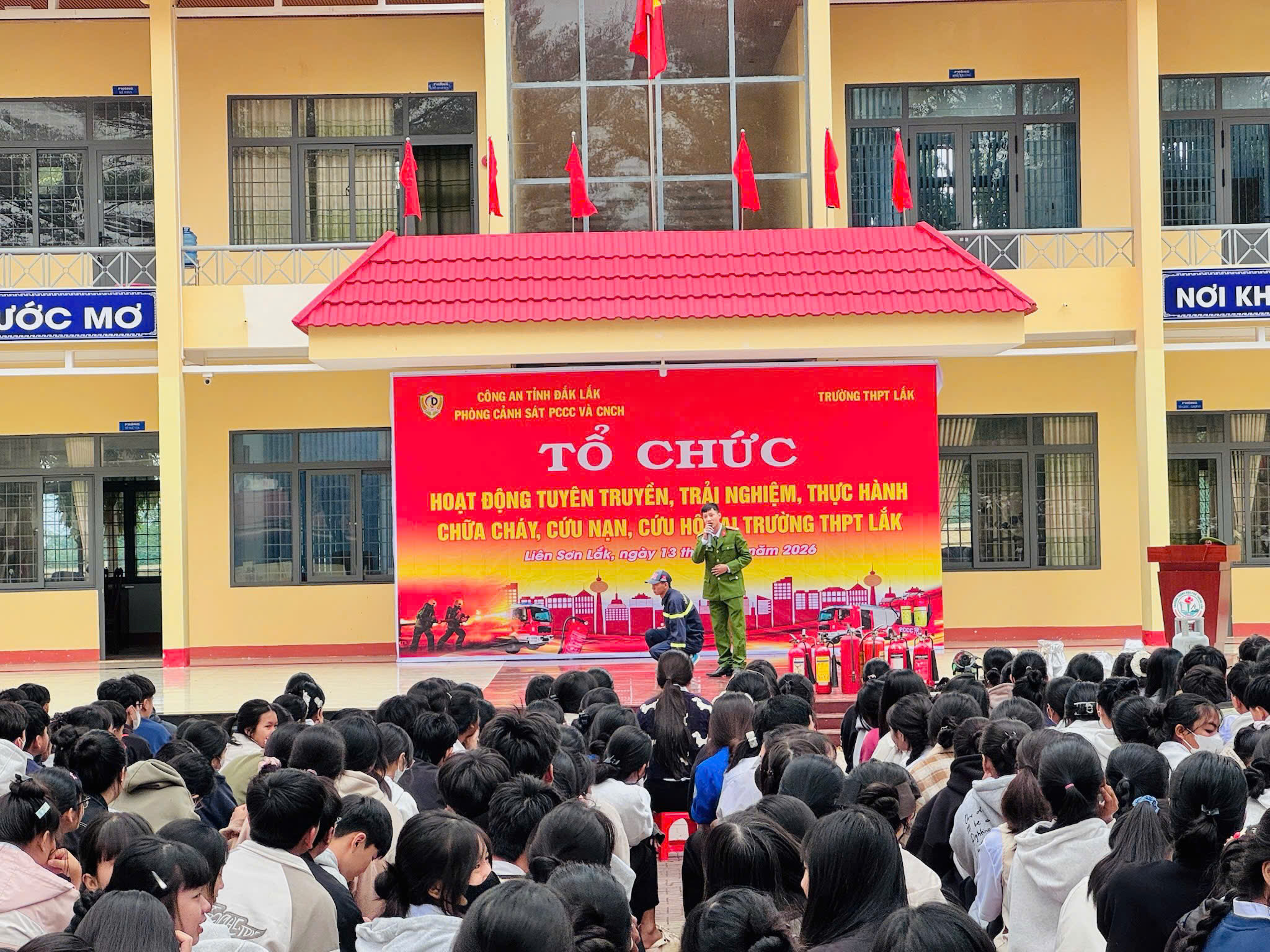 Sáng ngày 13/01/2026, Trường THPT Lắk đã phối hợp với Công an tỉnh Đắk Lắk – Phòng Cảnh sát Phòng cháy, chữa cháy và Cứu nạn, cứu hộ (PCCC & CNCH) tổ chức hoạt động tuyên truyền, trải nghiệm và thực hành kỹ năng phòng cháy, chữa cháy và cứu nạn, cứu hộ cho cán bộ, giáo viên và toàn thể học sinh nhà trường.