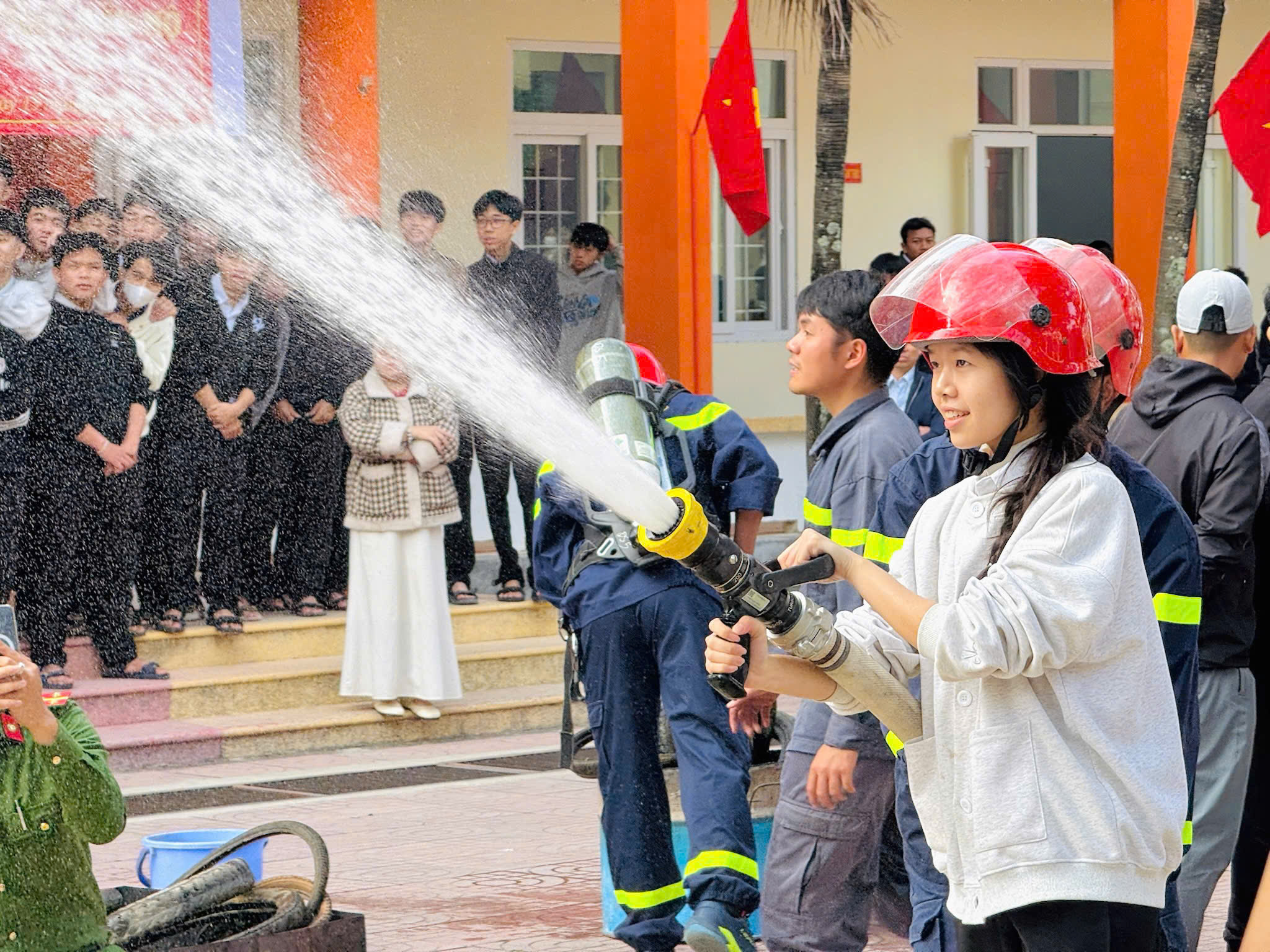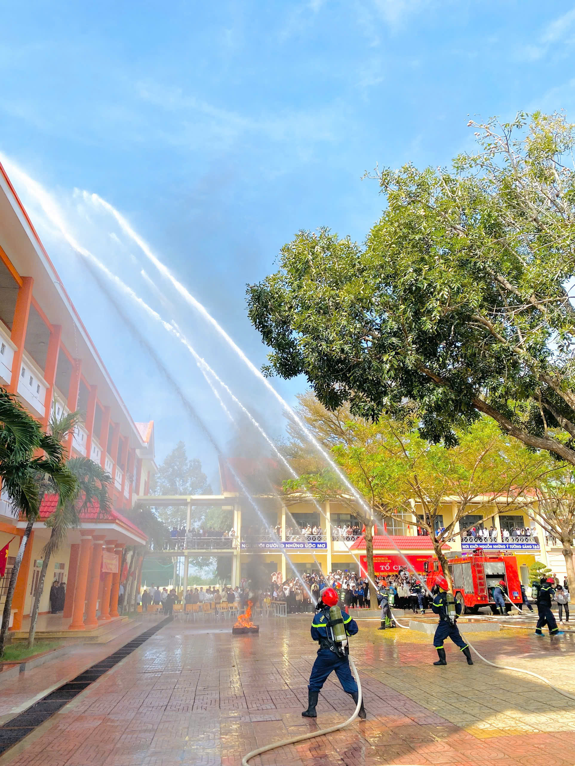 Điểm nhấn của hoạt động là phần trải nghiệm thực hành trực tiếp, khi học sinh được hướng dẫn sử dụng bình chữa cháy, vòi phun nước và tham gia xử lý các tình huống giả định dưới sự hỗ trợ, hướng dẫn tận tình của lực lượng Cảnh sát PCCC & CNCH. Không khí buổi diễn tập diễn ra nghiêm túc nhưng sôi nổi, thu hút sự quan tâm và tạo sự hứng thú rõ nét cho học sinh.