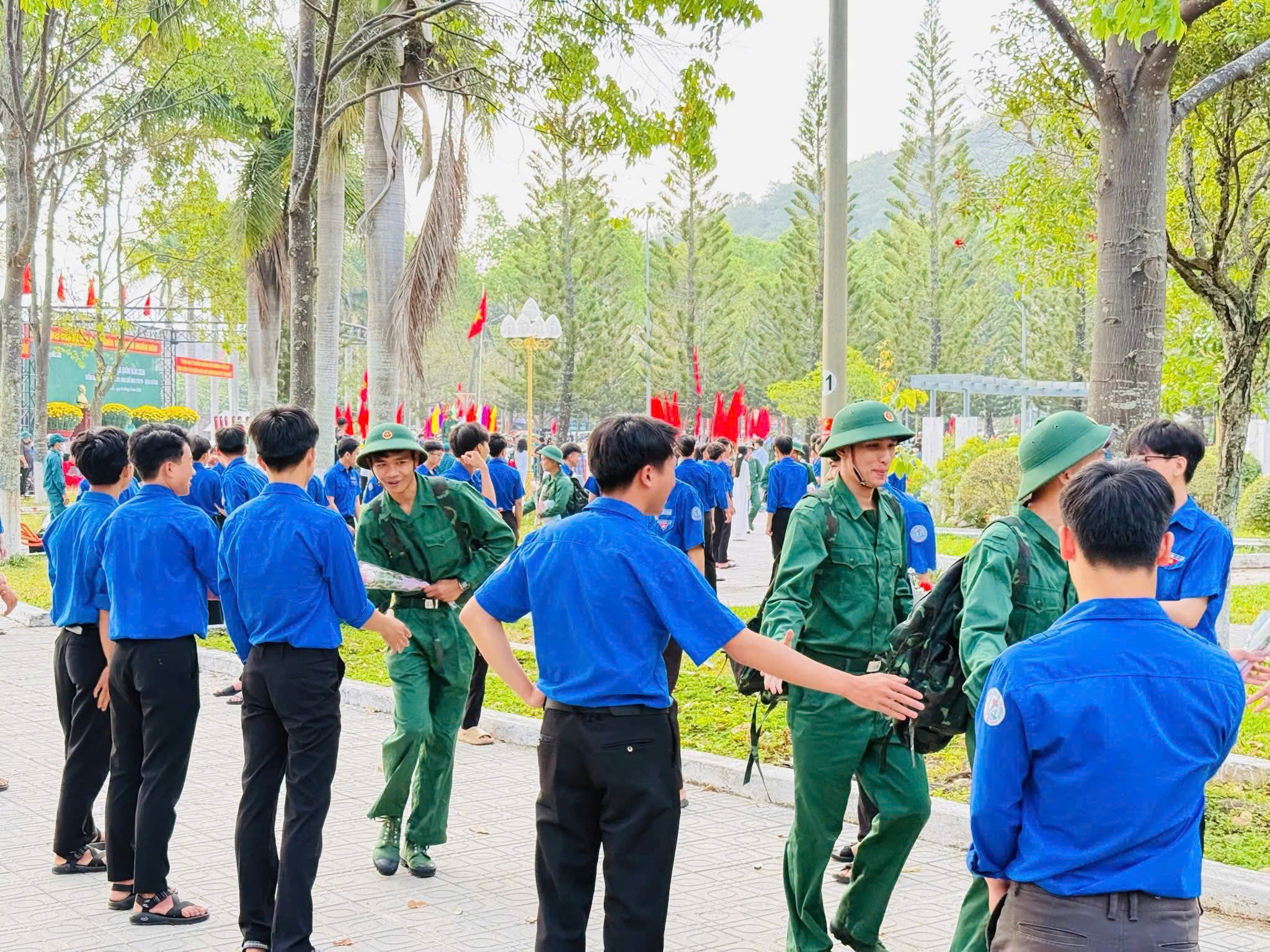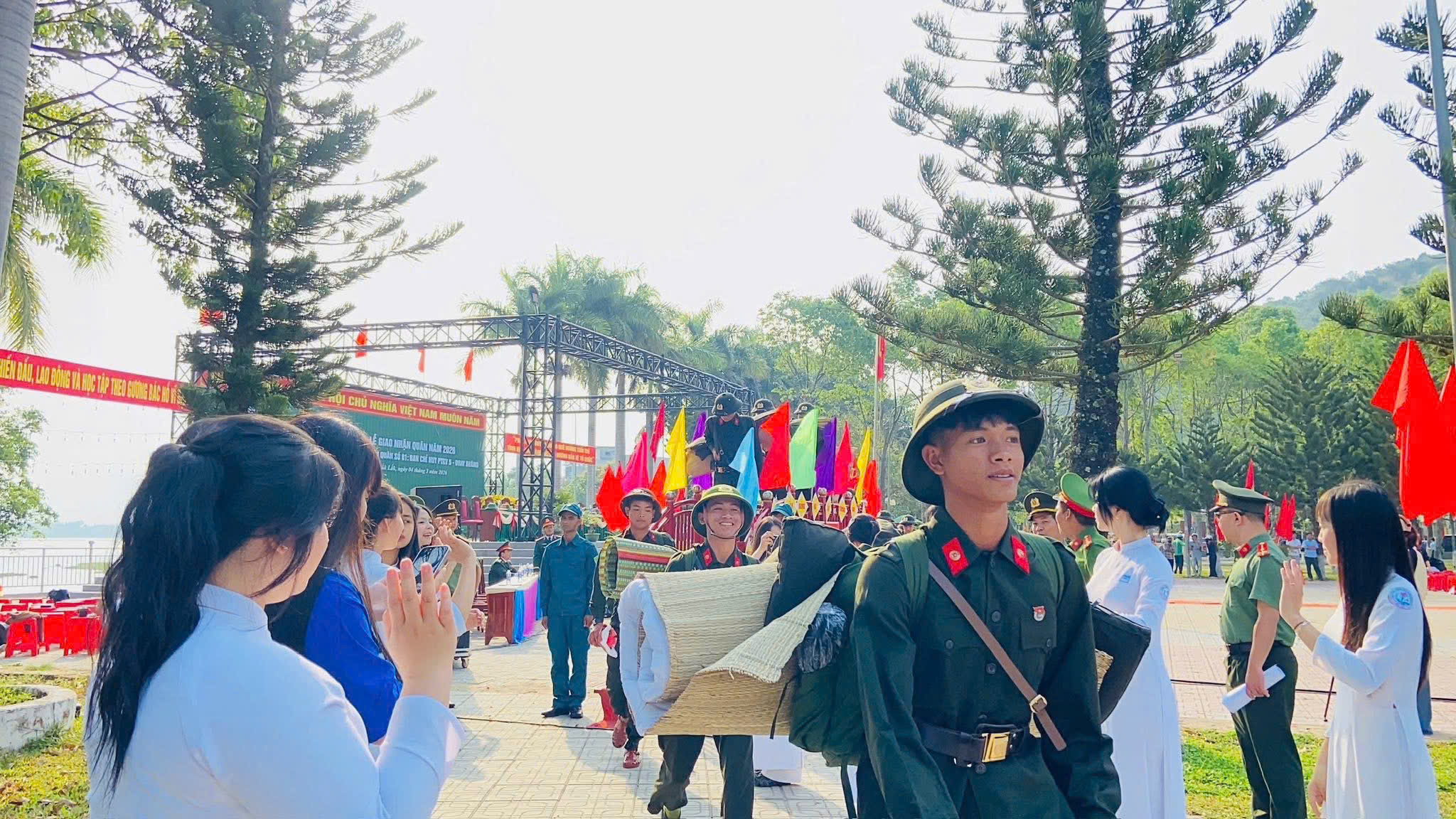 Học sinh chào tạm biệt các thanh niên địa phương lên đường thực hiện nghĩa vụ thiêng liêng đối với Tổ quốc.