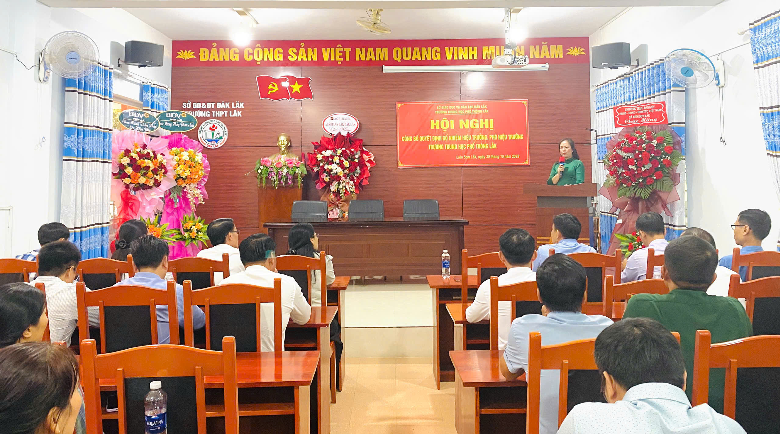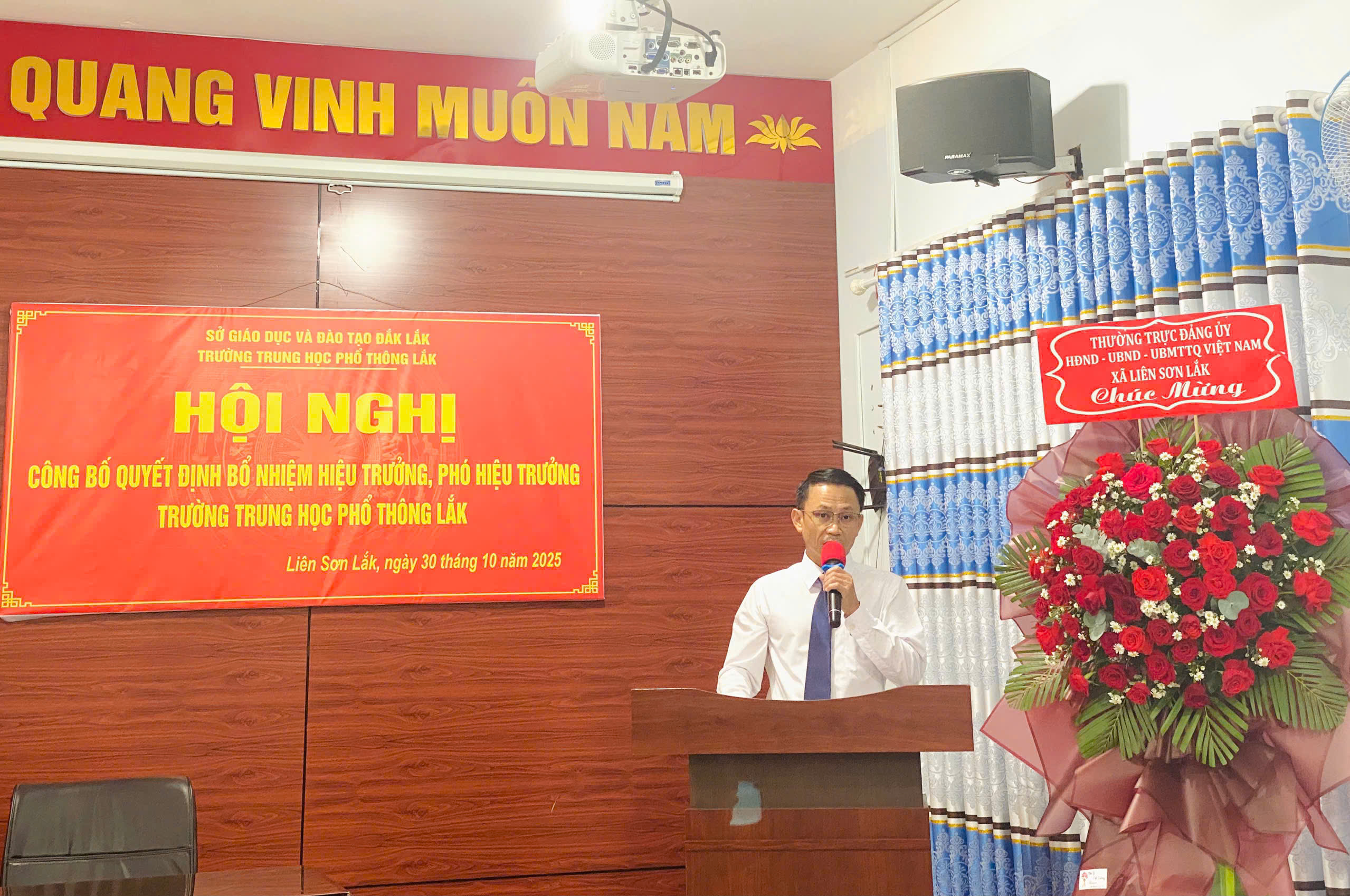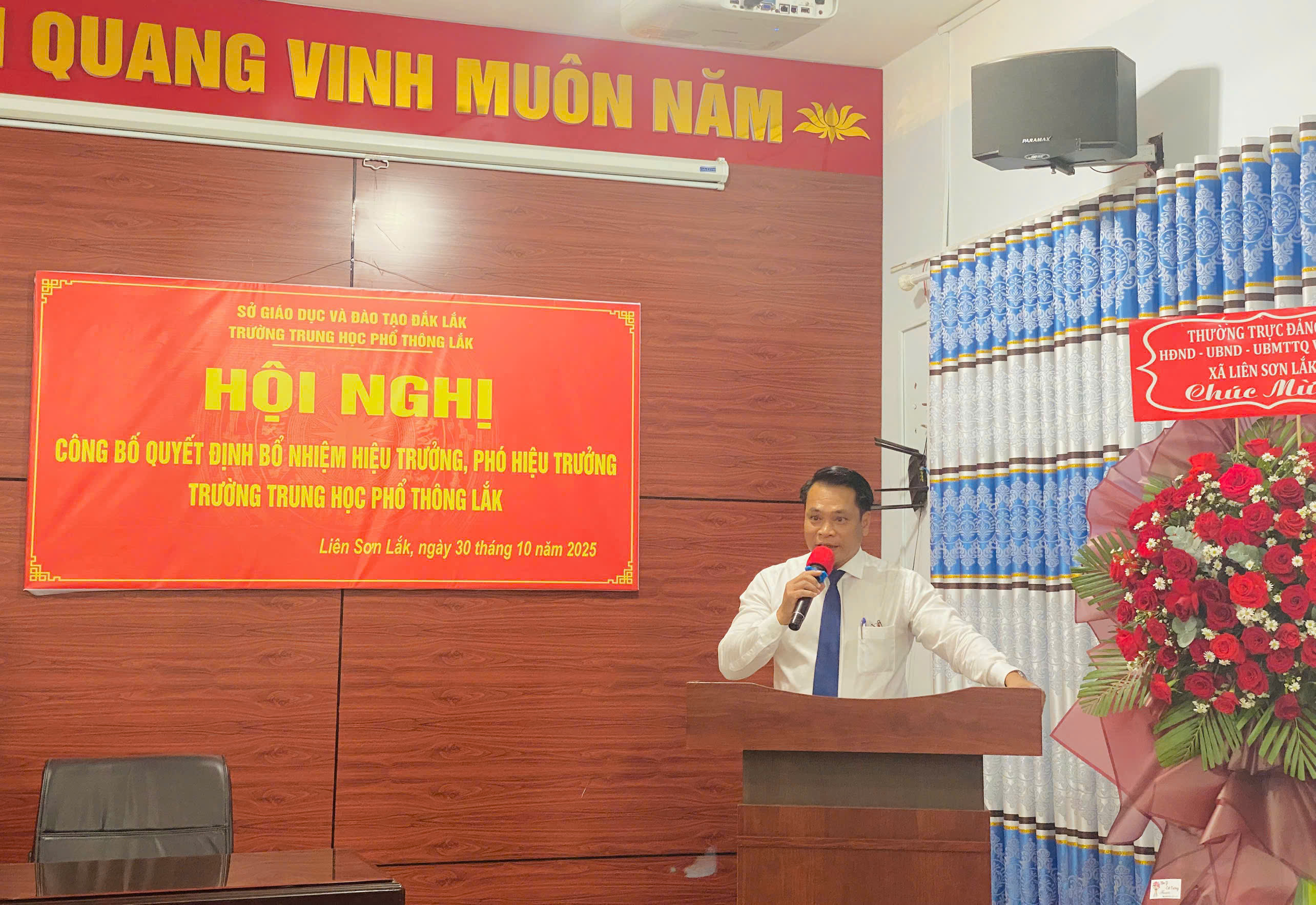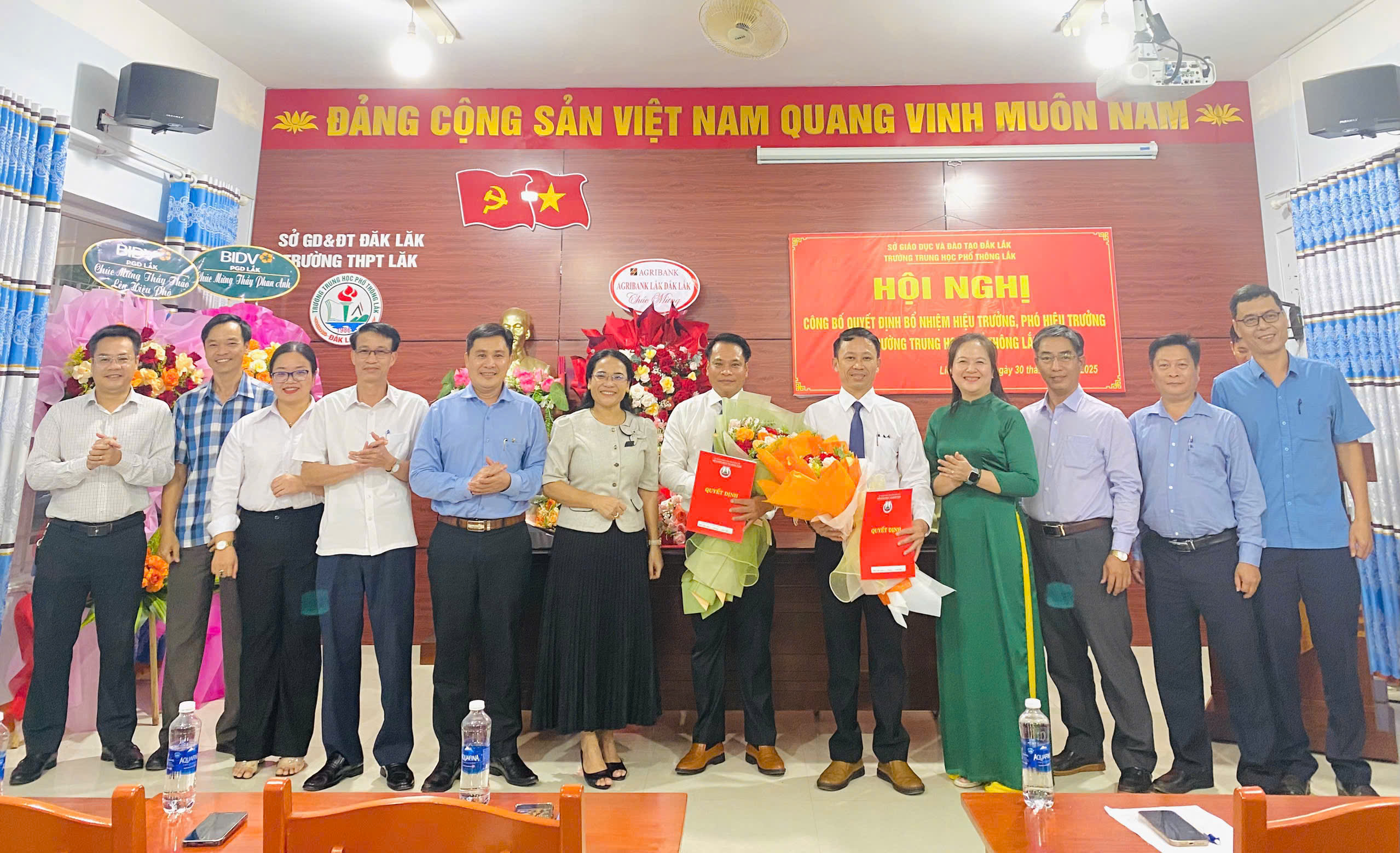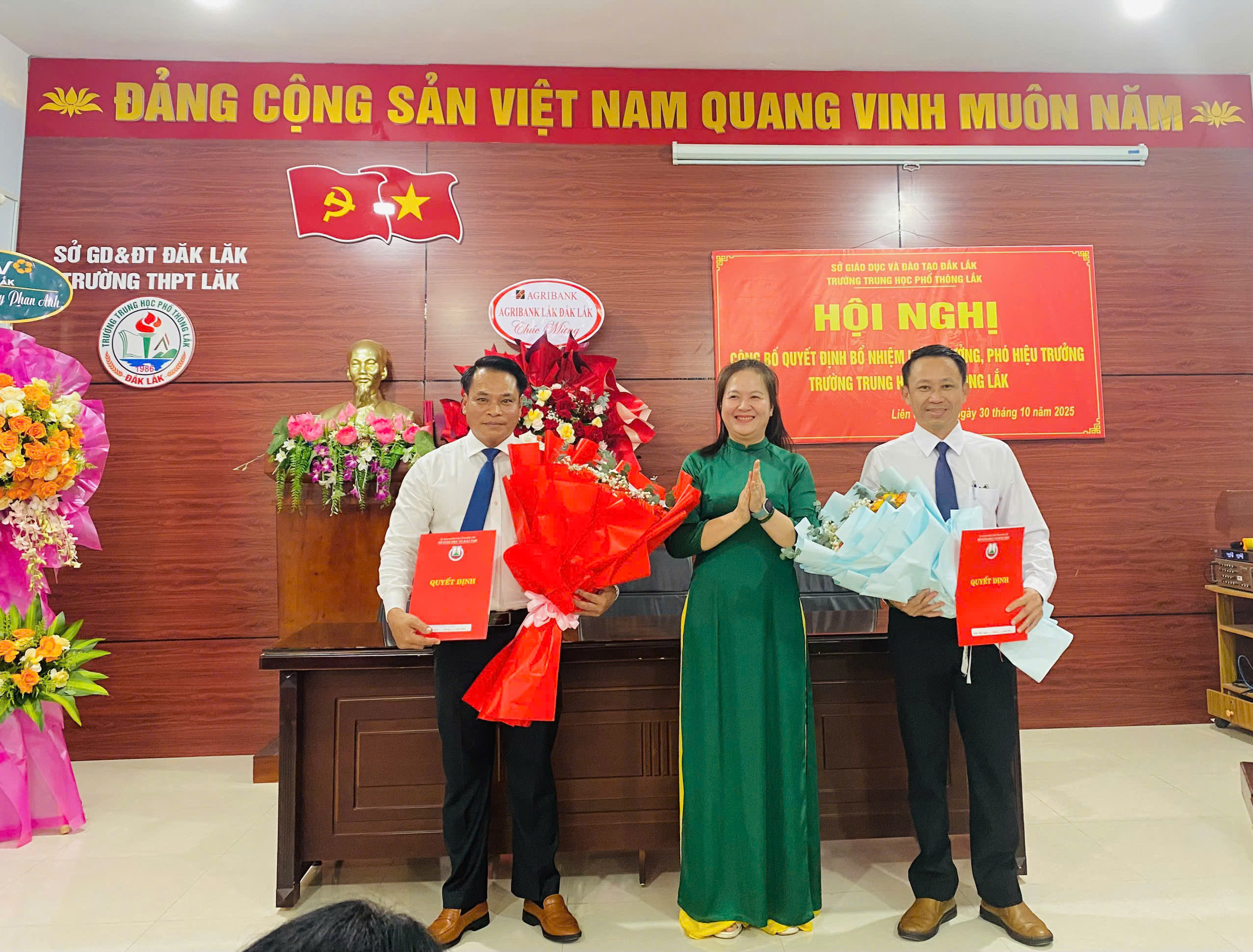 Tại buổi lễ, thừa ủy quyền của Giám đốc Sở GD&ĐT, đại diện Phòng Tổ chức cán bộ đã công bố Quyết định số 902/QĐ-SGDĐT ngày 29/10/2025 về việc bổ nhiệm thầy Nguyễn Phan Anh, Phó Hiệu trưởng phụ trách Trường THPT Lắk, giữ chức vụ Hiệu trưởng Trường THPT Lắk, thời hạn bổ nhiệm 5 năm kể từ ngày 01/11/2025; và Quyết định số 903/QĐ-SGDĐT ngày 29/10/2025 về việc bổ nhiệm thầy Nguyễn Văn Thảo, Tổ trưởng chuyên môn Trường THPT Lắk, giữ chức vụ Phó Hiệu trưởng Trường THPT Lắk, thời hạn bổ nhiệm 5 năm kể từ ngày 01/11/2025.