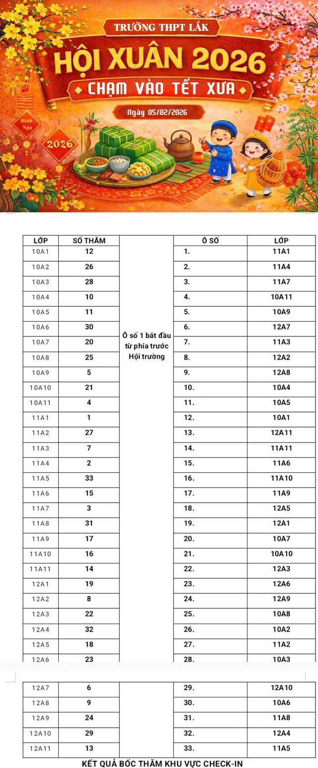 Trường THPT Lắk trân trọng thông báo và đề nghị giáo viên chủ nhiệm cùng các tập thể lớp nghiêm túc triển khai thực hiện theo nội dung trên, góp phần tổ chức Hội Xuân 2026 – “Chạm vào Tết xưa” diễn ra an toàn, hiệu quả và đúng kế hoạch.