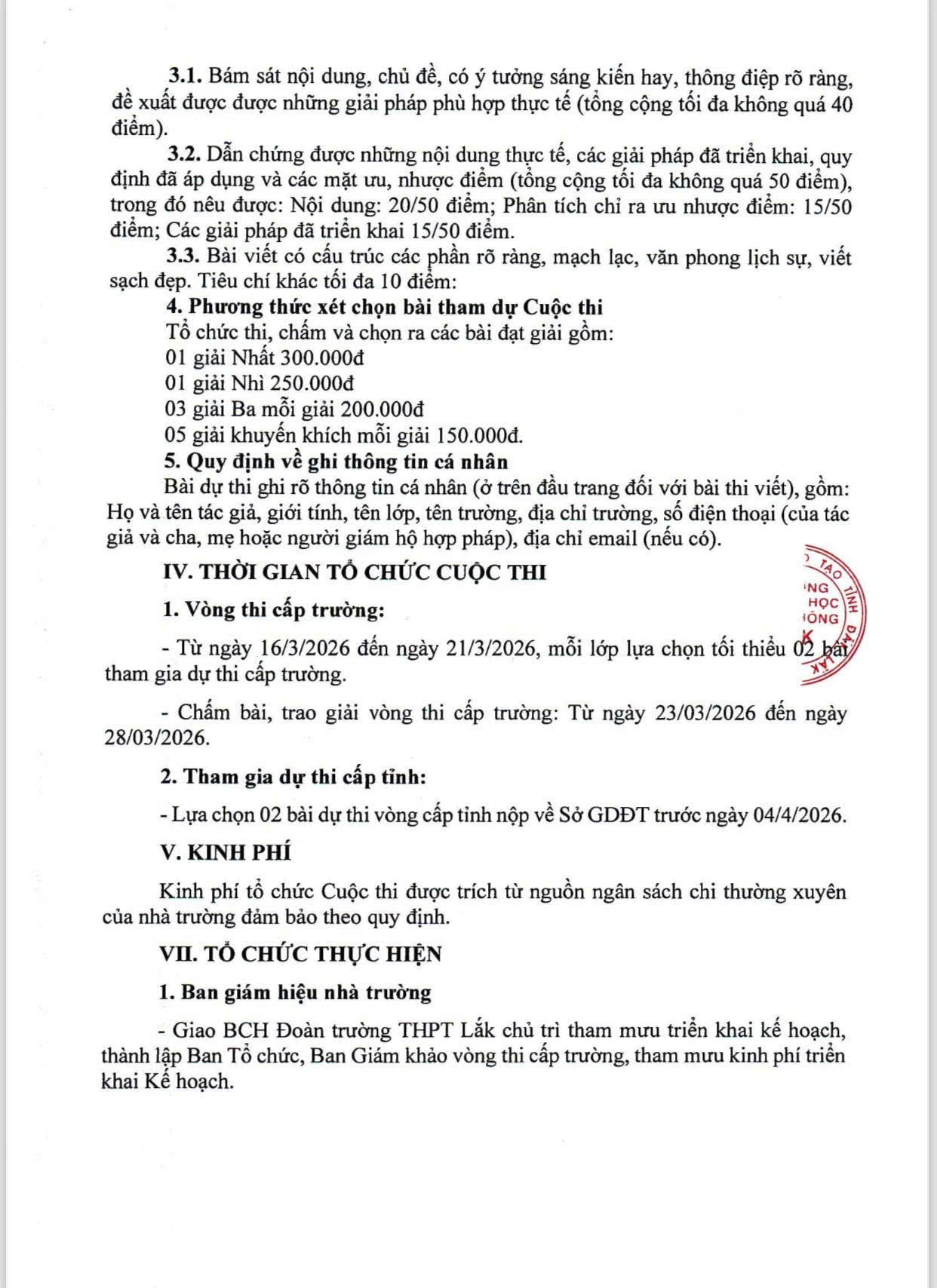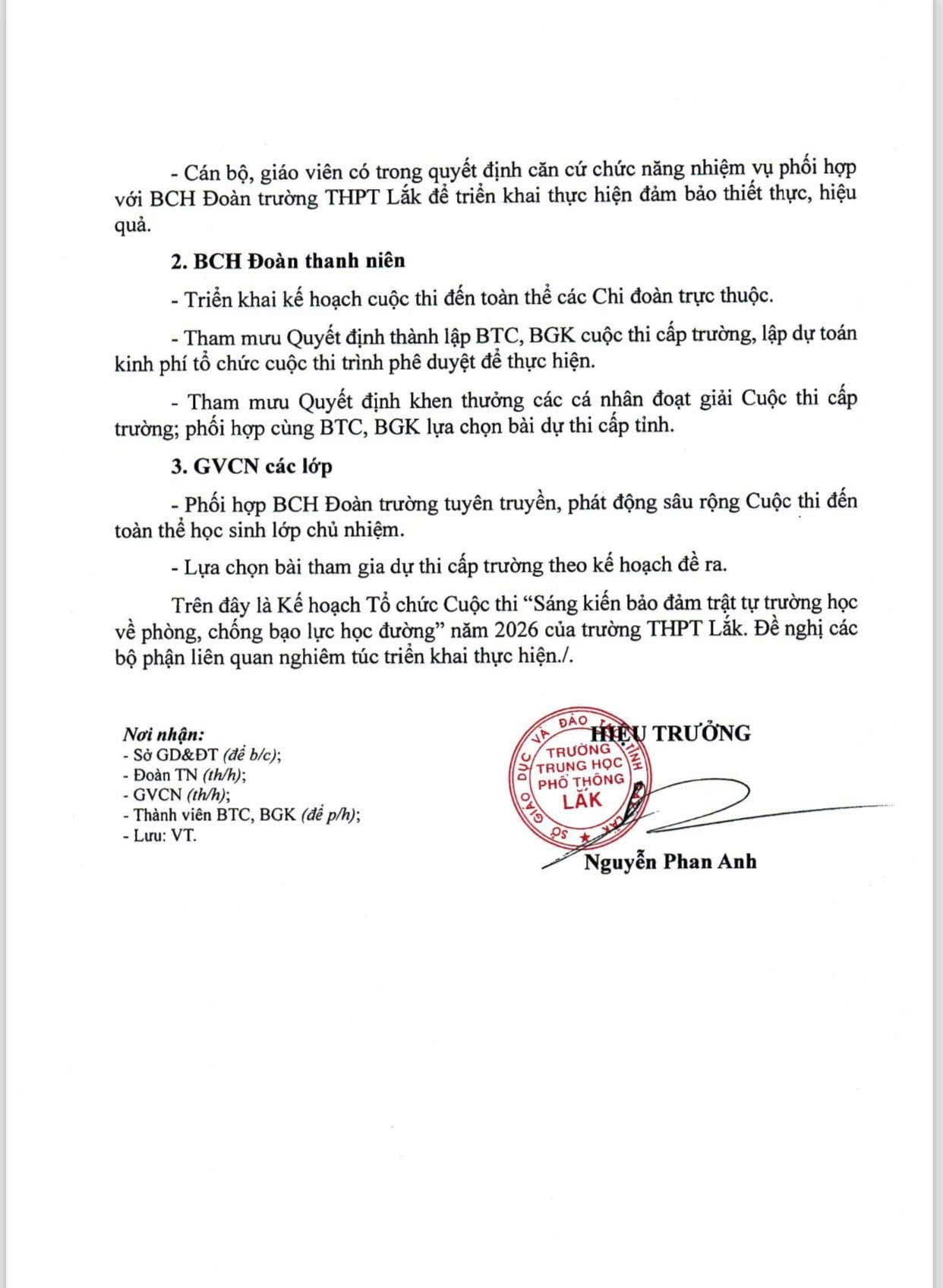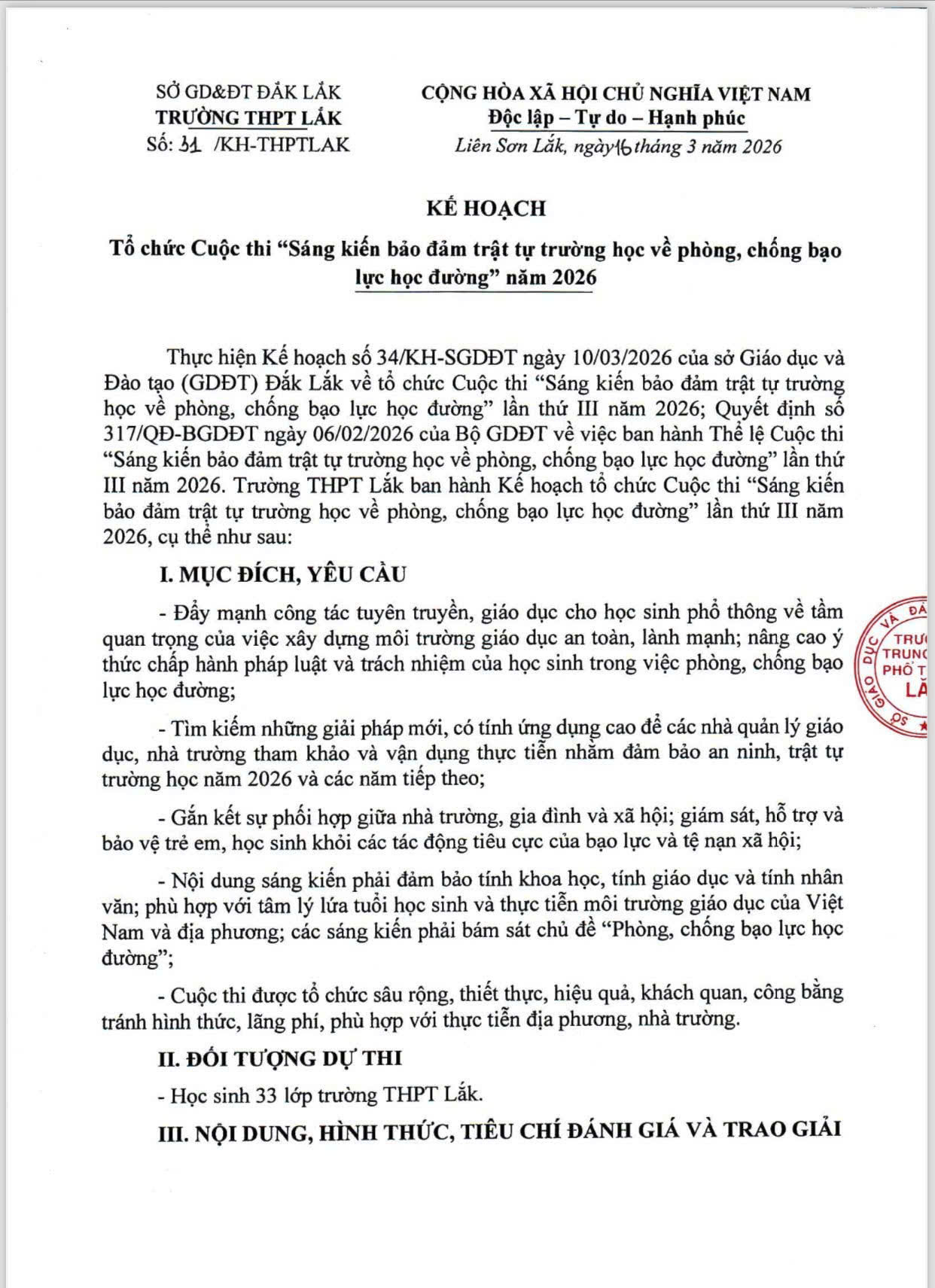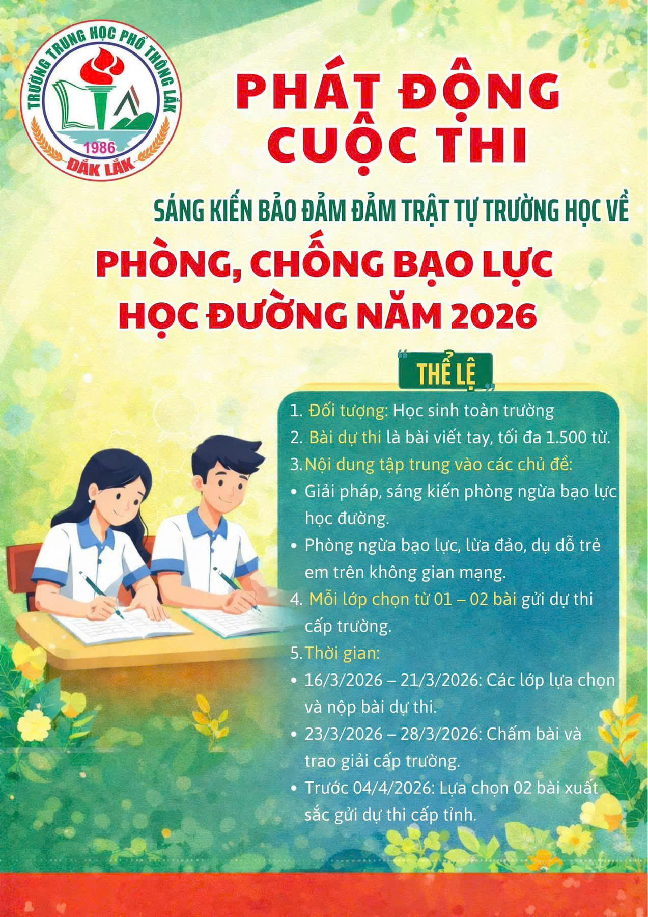 Nhằm nâng cao nhận thức của học sinh trong việc xây dựng môi trường học đường an toàn, thân thiện, nói không với bạo lực, Trường THPT Lắk chính thức phát động cuộc thi “Sáng kiến bảo đảm trật tự trường học về phòng, chống bạo lực học đường” năm 2026. Đây là hoạt động ý nghĩa, góp phần lan tỏa những giá trị tích cực và khuyến khích học sinh chủ động đề xuất các giải pháp thiết thực trong thực tiễn học đường.