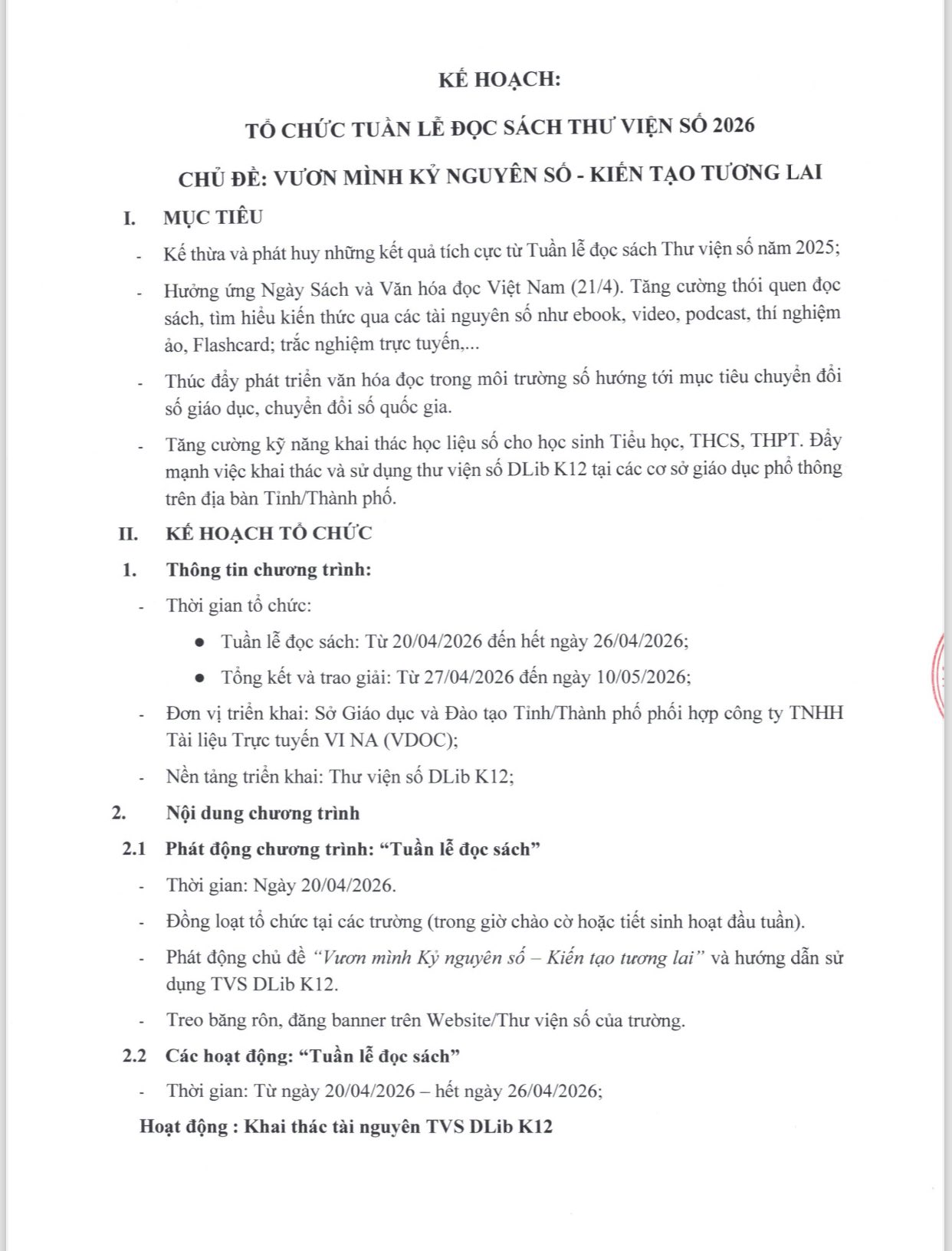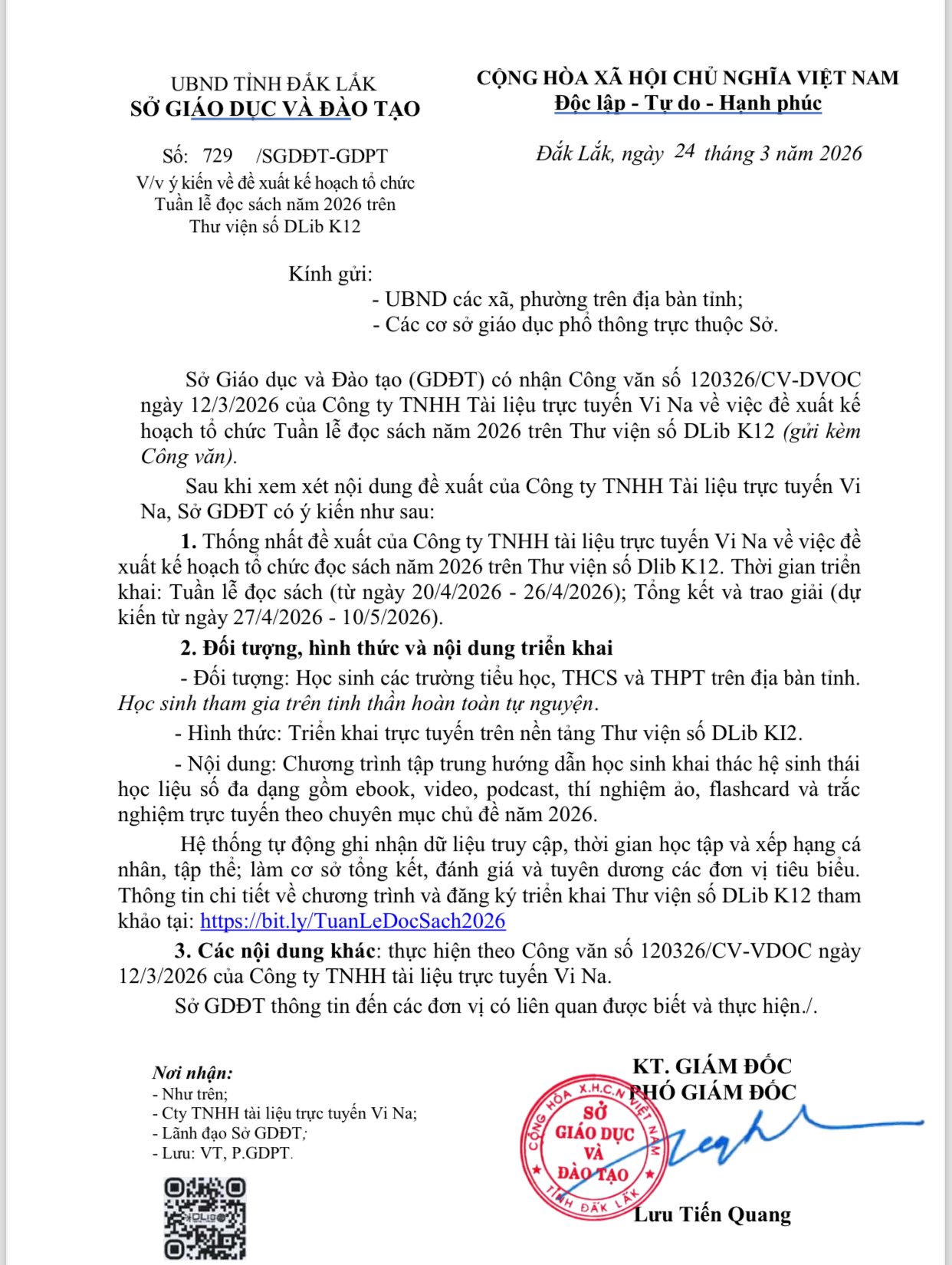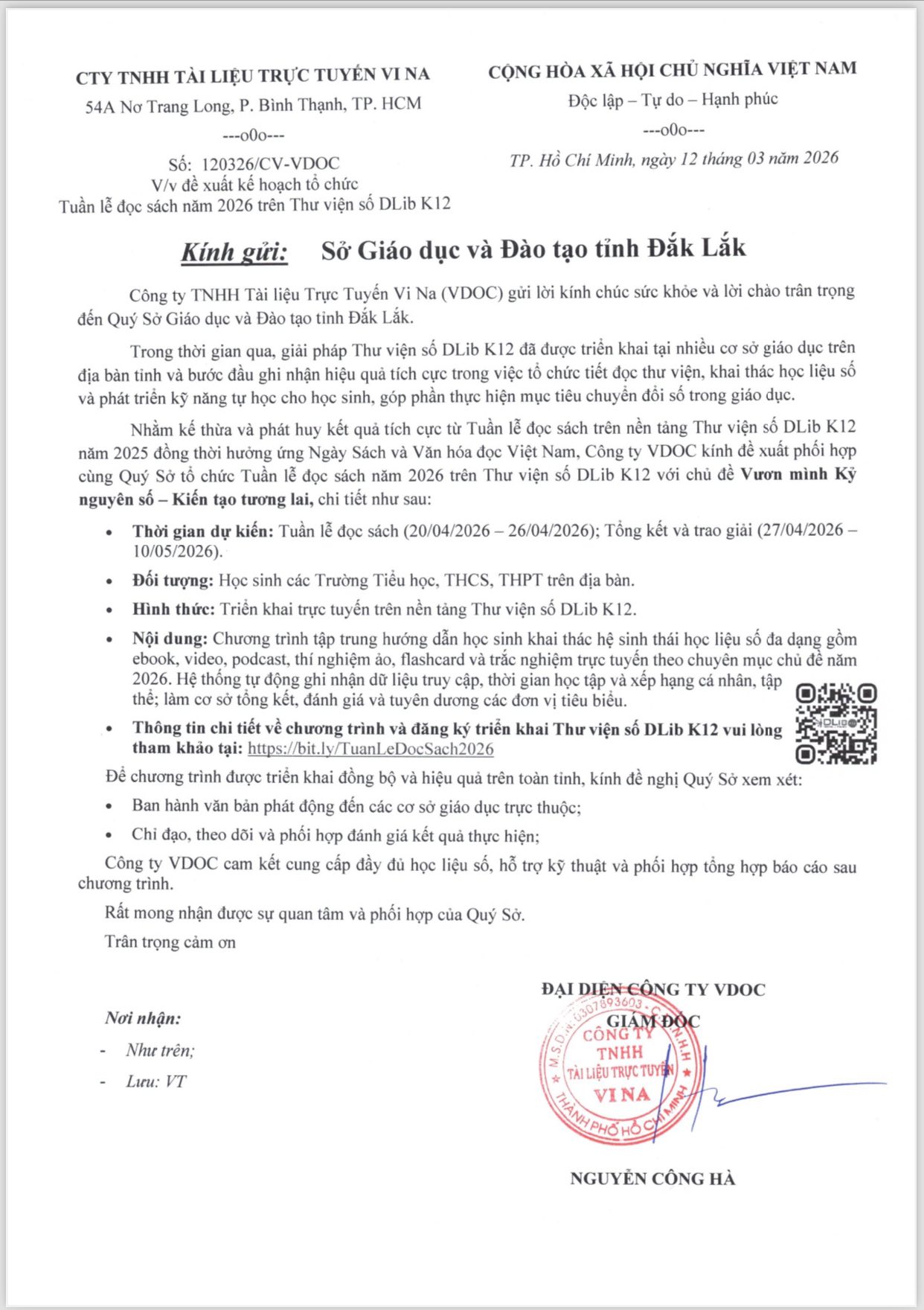 Công văn số 120326/CV-VDOC về đề xuất tổ chức Tuần lễ đọc sách 2026 trên DLib K12.
