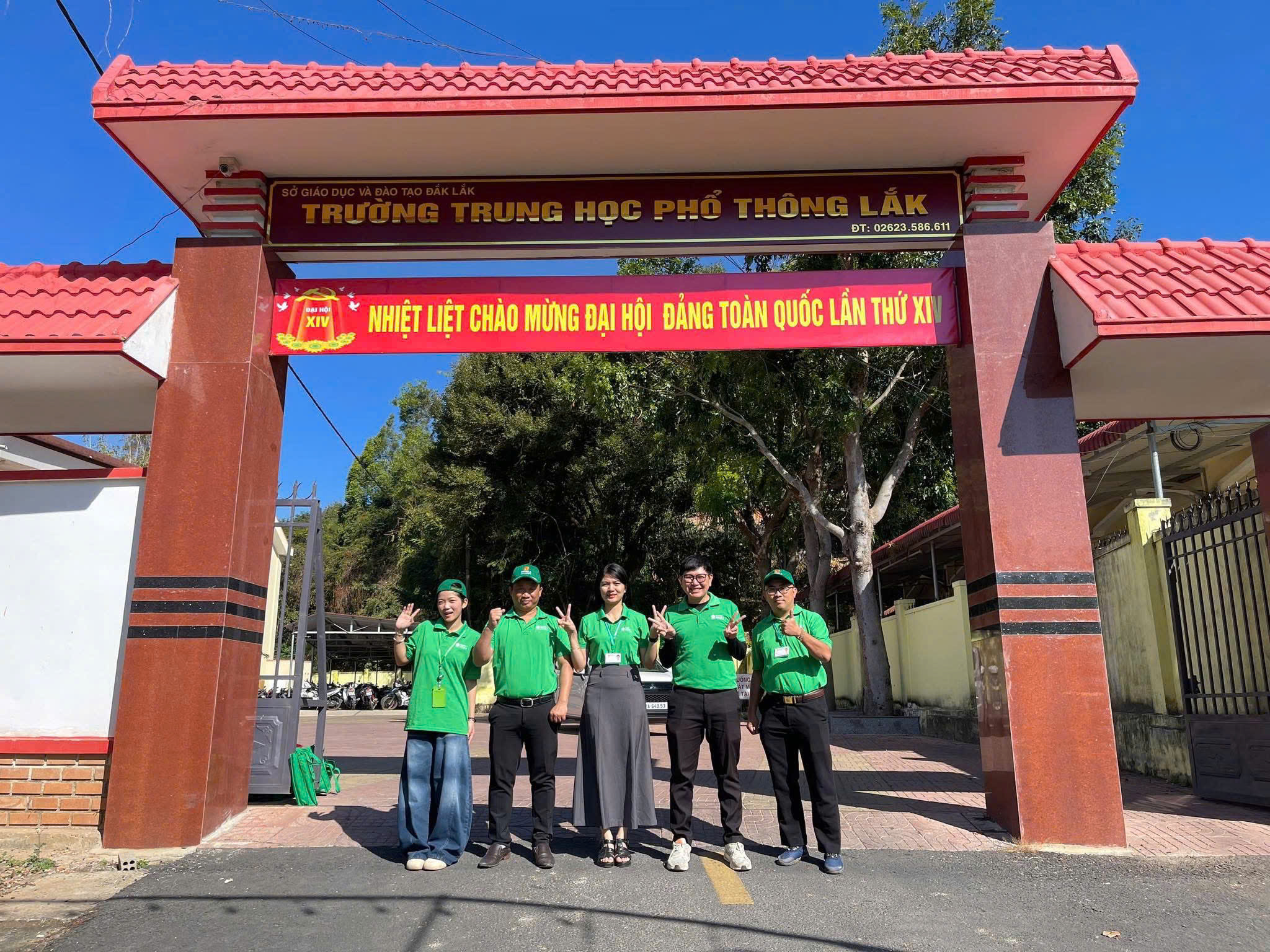 Đại diện Đại học Đông Á chụp ảnh lưu niệm tại Trường THPT Lắk trong chương trình tư vấn, định hướng nghề nghiệp dành cho học sinh khối 12 (2K8).