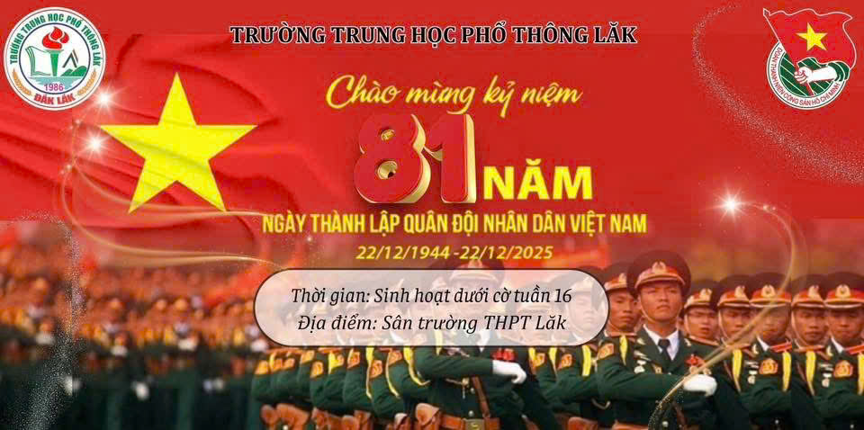 Sáng thứ Hai, ngày 22/12/2025, thầy và trò Trường THPT Lắk đã long trọng tổ chức buổi sinh hoạt dưới cờ chào mừng 81 năm Ngày thành lập Quân đội Nhân dân Việt Nam (22/12/1944 – 22/12/2025) và 36 năm Ngày hội Quốc phòng toàn dân, trong không khí trang nghiêm, tự hào và giàu cảm xúc.