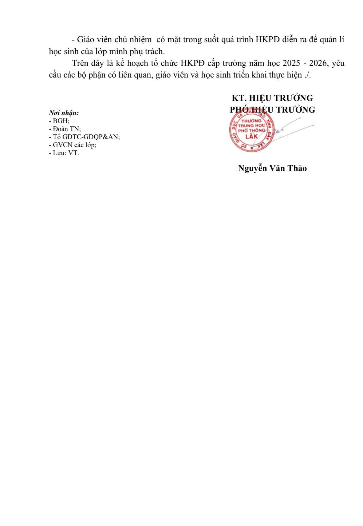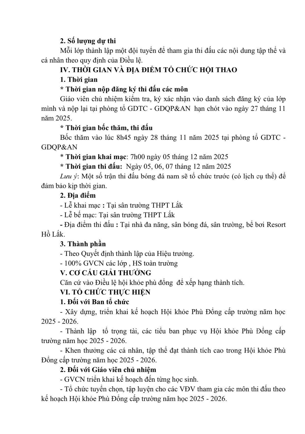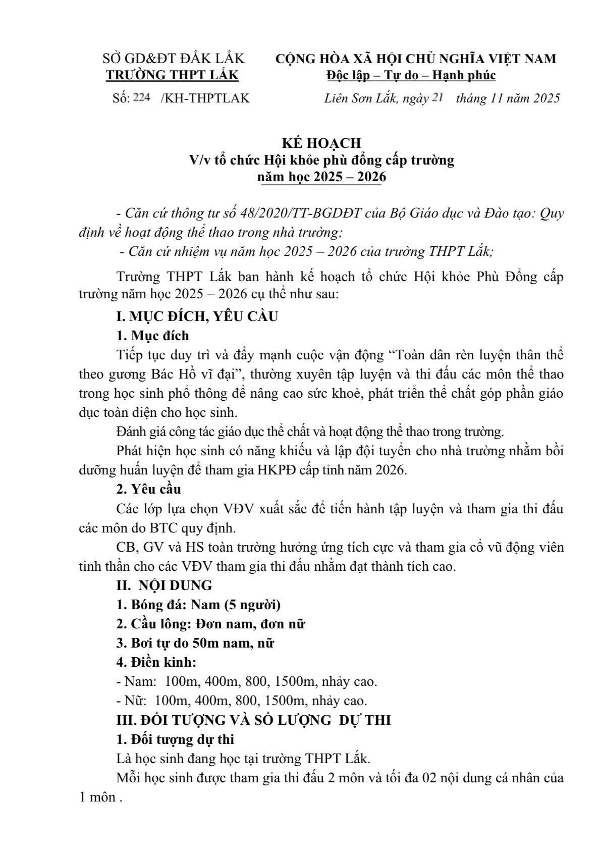Kế hoạch Hội khỏe Phù Đổng của Trường THPT Lăk năm 2025 – 2026.