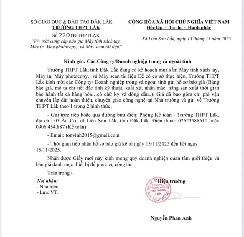 Thông báo mời cung cấp báo giá thiết bị công nghệ – Trường THPT Lăk.