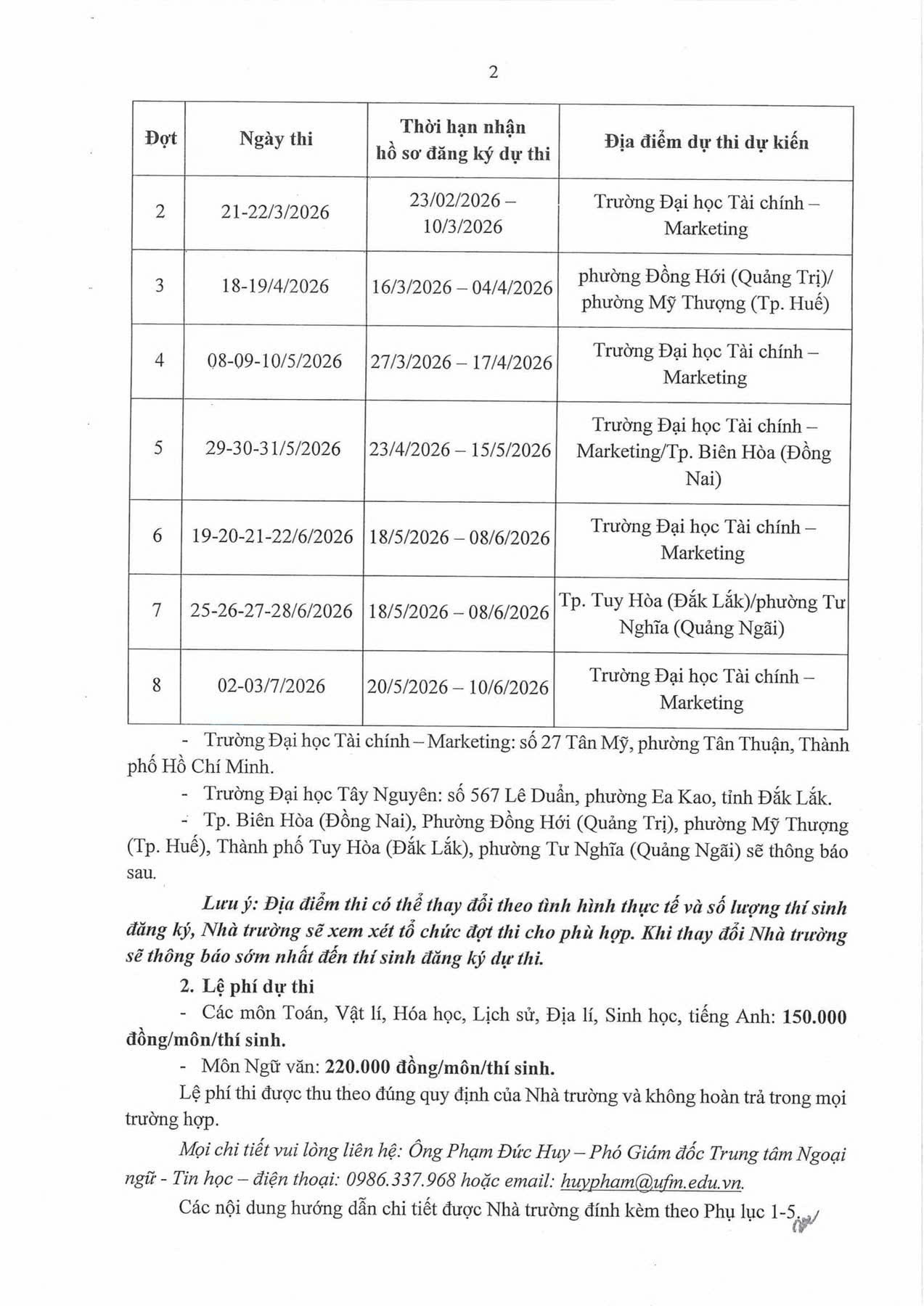 Về thời gian và địa điểm tổ chức, kỳ thi dự kiến được triển khai qua nhiều đợt tại các cơ sở đào tạo trên cả nước. Một số đợt tiêu biểu gồm: đợt 1 diễn ra vào ngày 14–15/3/2026 tại Trường Đại học Tây Nguyên, thời gian nhận hồ sơ từ 06/02/2026 đến 02/3/2026; đợt 2 tổ chức vào 21–22/3/2026 tại Trường Đại học Tài chính – Marketing; đợt 3 vào 18–19/4/2026 tại Quảng Trị hoặc TP. Huế; và đợt 7 diễn ra trong các ngày 25–26–27–28/6/2026 tại TP. Tuy Hòa (Đắk Lắk) hoặc Quảng Ngãi. Lịch thi và địa điểm cụ thể có thể được điều chỉnh theo tình hình thực tế và sẽ được Trường Đại học Tài chính – Marketing thông báo chính thức.