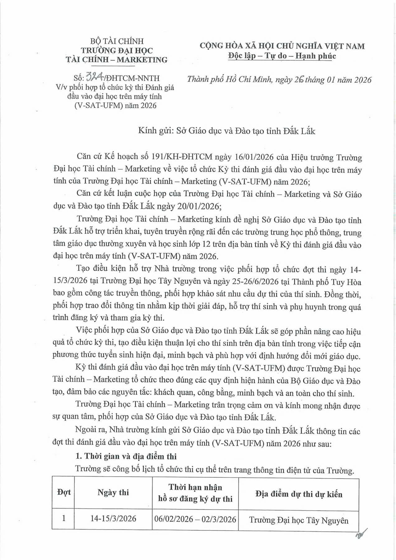 Công văn số 324/ĐHTCM-NNTH ngày 26/01/2026 của Trường Đại học Tài chính – Marketing về việc phối hợp tổ chức Kỳ thi đánh giá đầu vào đại học trên máy tính (V-SAT-UFM) năm 2026.