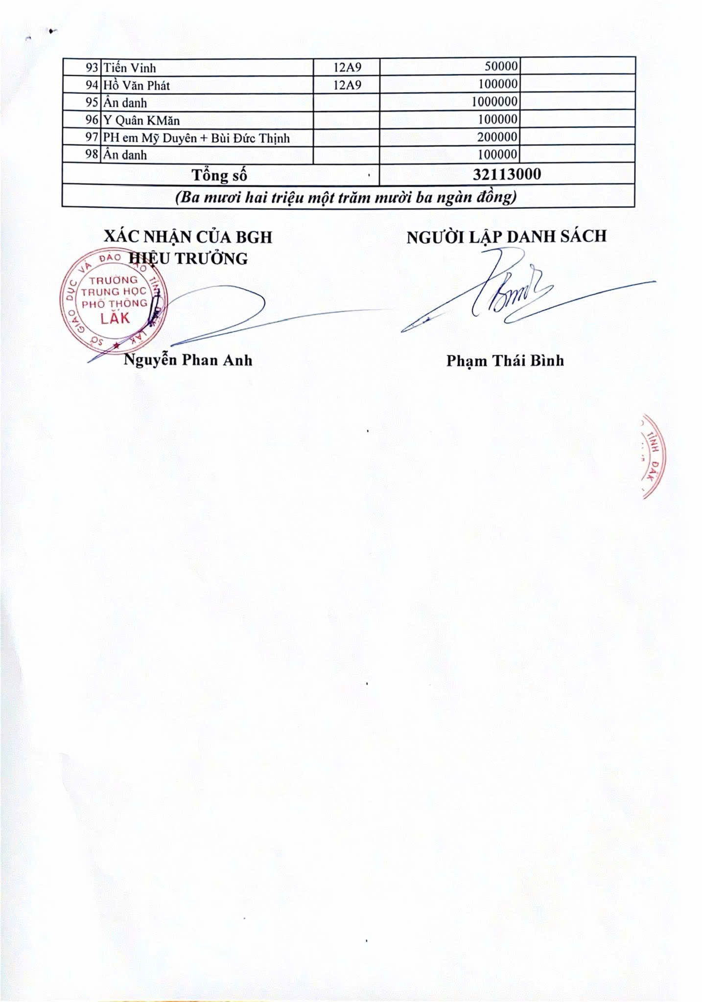 Nhà trường trân trọng thông báo rằng toàn bộ số tiền và vật phẩm của thầy cô, phụ huynh và học sinh đã được thống kê, lập sao kê đầy đủ và bàn giao minh bạch – đúng quy định – đến Ủy ban Mặt trận Tổ quốc xã Liên Sơn Lắk, tỉnh Đắk Lắk. Đây là cam kết rõ ràng của nhà trường trong việc chuyển gửi đúng địa chỉ, đúng đối tượng cần hỗ trợ.