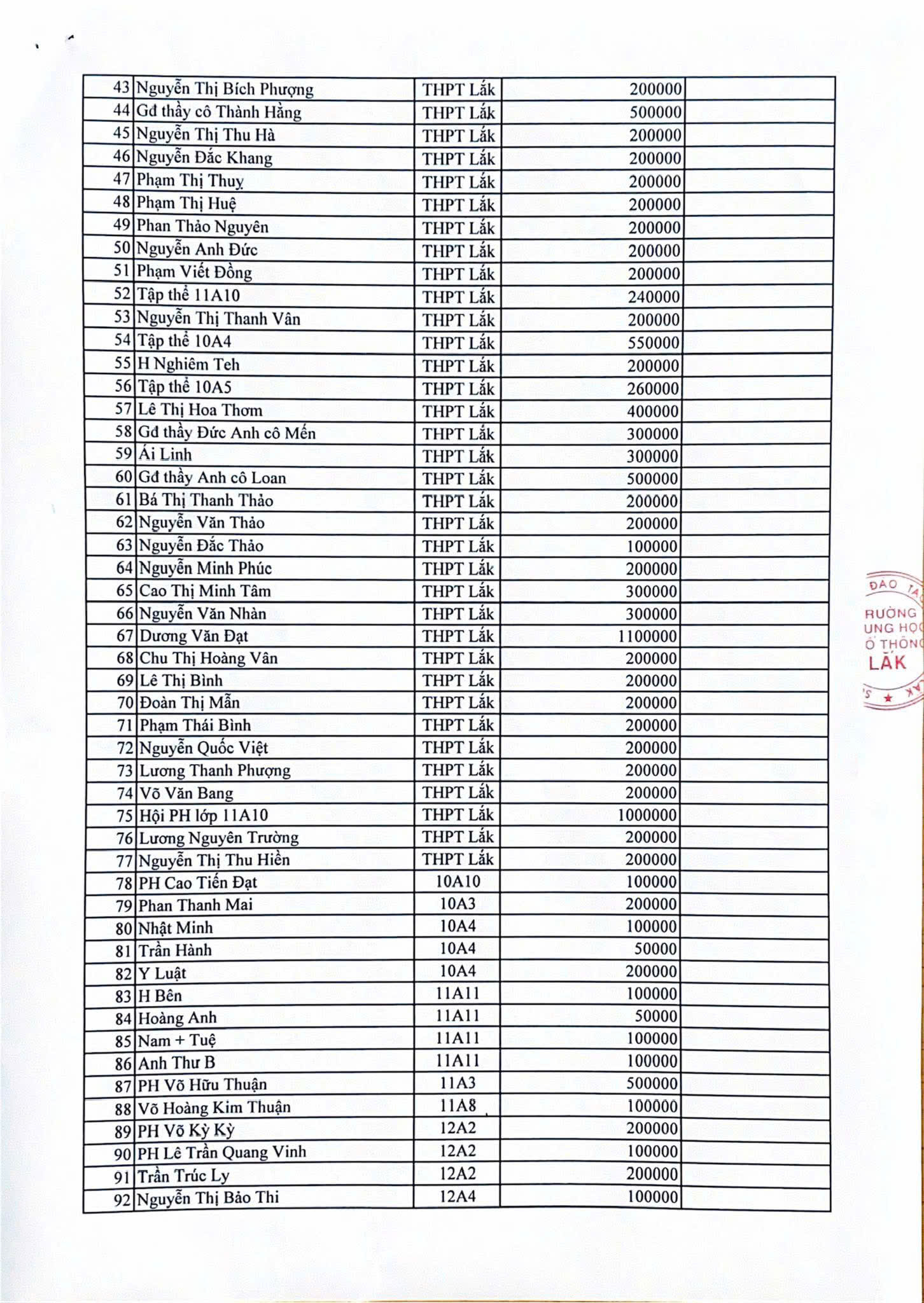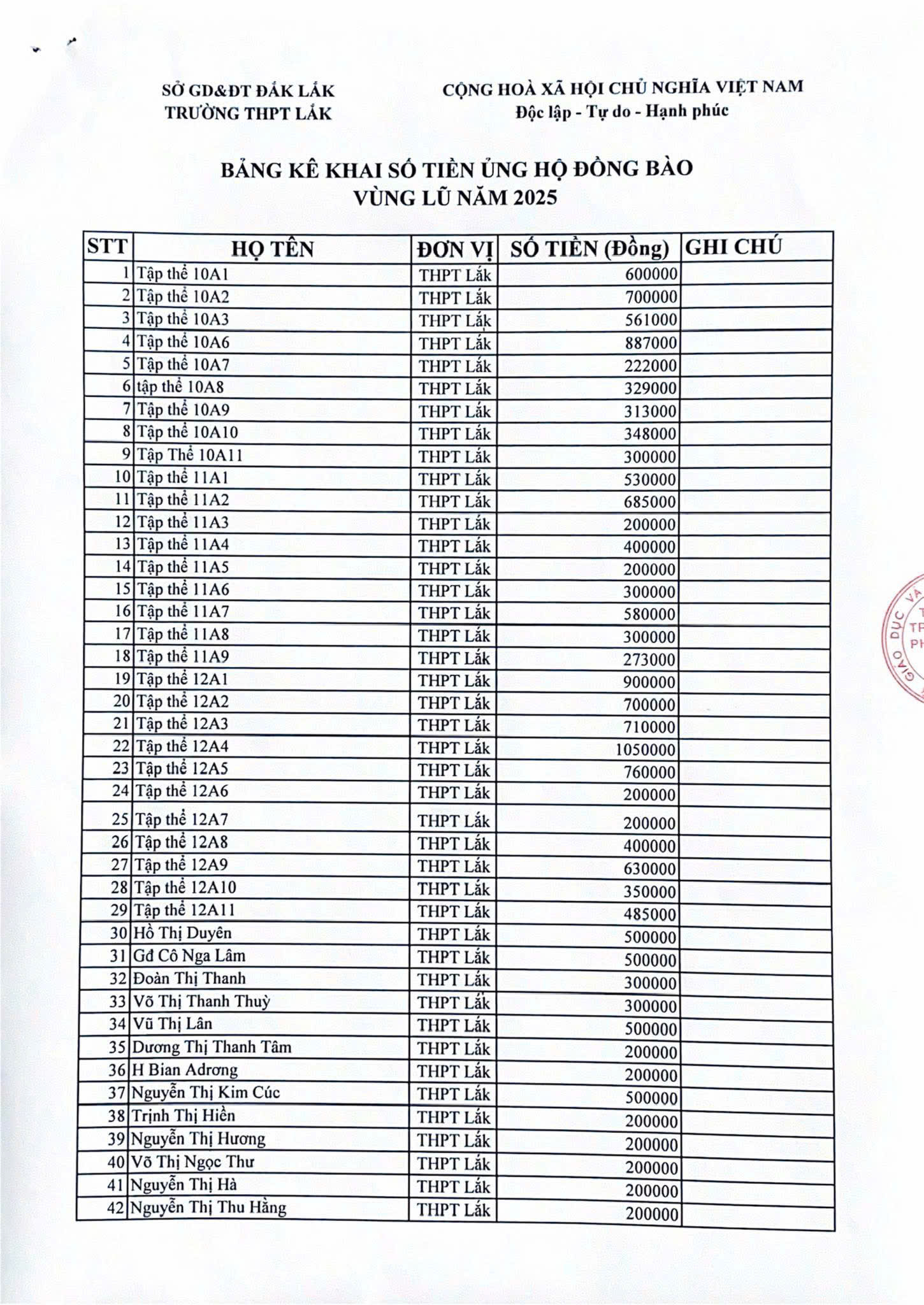 Ban Giám hiệu Trường THPT Lắk trân trọng gửi lời cảm ơn sâu sắc đến quý thầy cô giáo, cán bộ nhân viên, phụ huynh và các em học sinh đã đồng lòng hưởng ứng đợt quyên góp hỗ trợ đồng bào bị ảnh hưởng bởi mưa lũ. Sự chung tay của toàn trường trong những ngày qua đã tạo nên một hành động đẹp, thể hiện tinh thần nhân ái và trách nhiệm với cộng đồng.