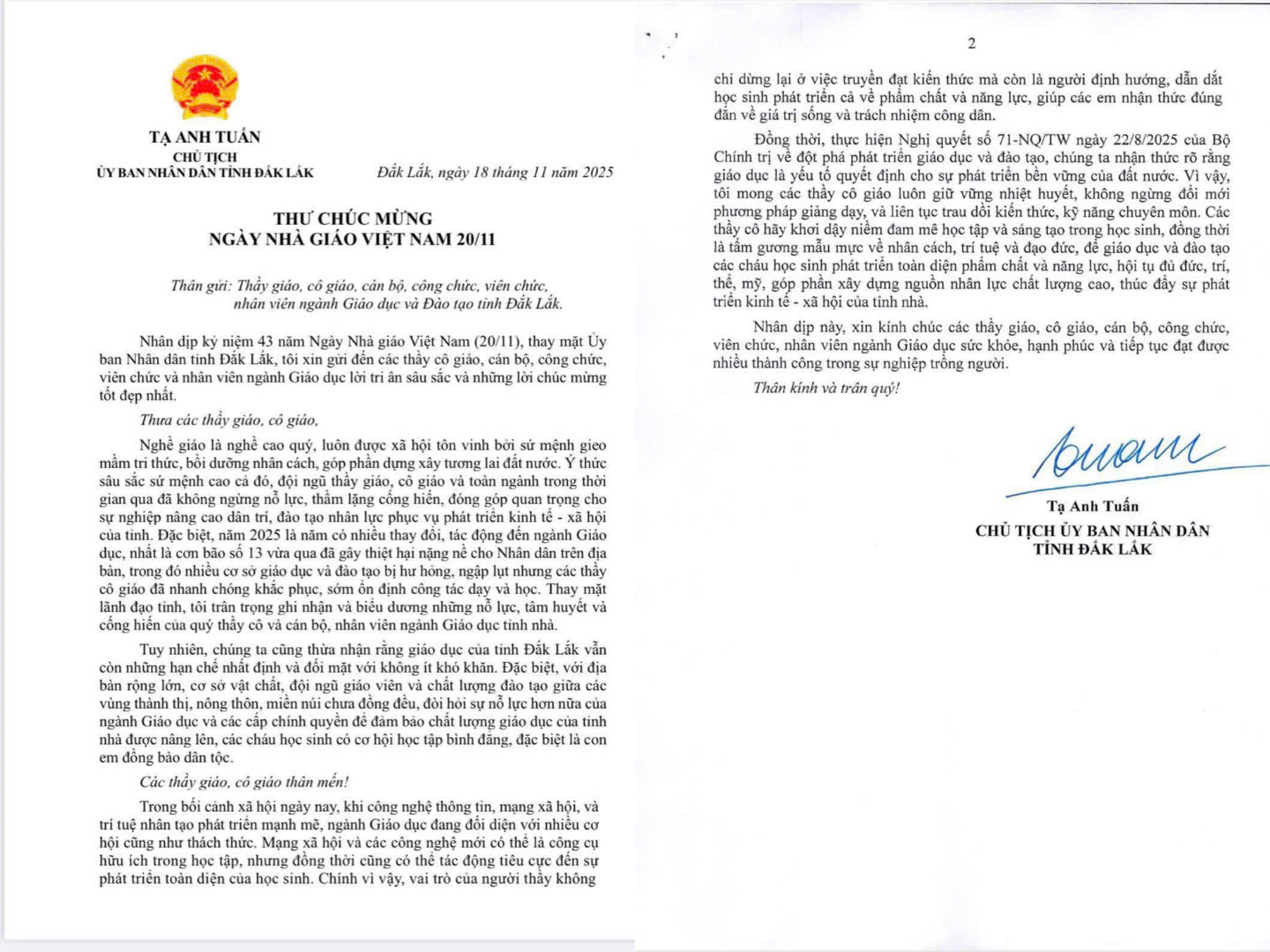 Thư Chúc Mừng của Chủ tịch UBND tỉnh Đắk Lắk gửi đến toàn thể đội ngũ thầy giáo, cô giáo, cán bộ, công chức, viên chức và người lao động trong ngành Giáo dục – Đào tạo tỉnh.