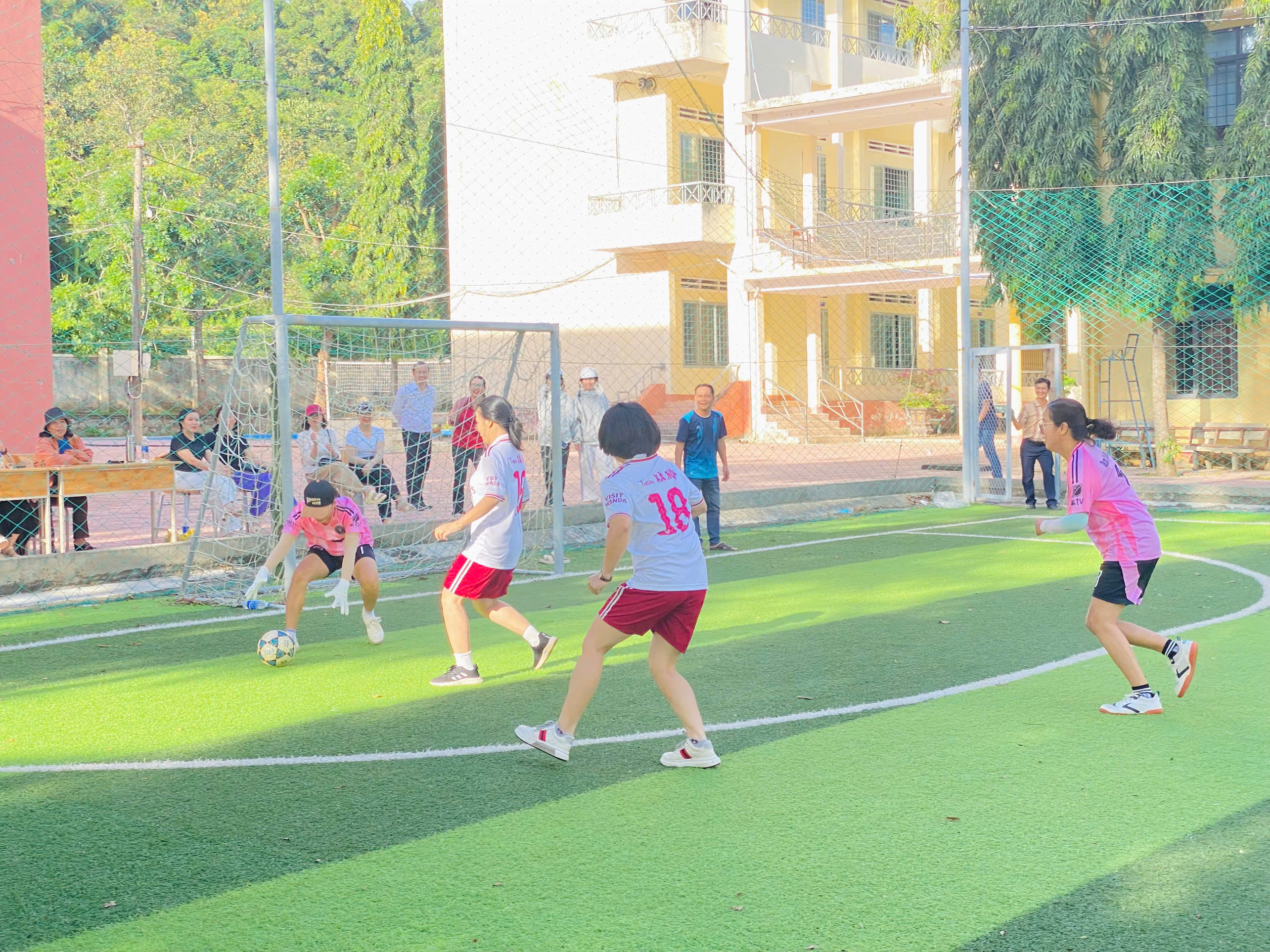 Ngay từ những phút đầu tiên, trận đấu đã diễn ra đầy sôi nổi và hấp dẫn. Các “nữ cầu thủ” – những cô giáo, nhân viên của nhà trường – đã thể hiện tinh thần thi đấu nhiệt huyết, phối hợp ăn ý cùng nhiều pha bóng đẹp mắt khiến người xem không khỏi trầm trồ, thích thú.