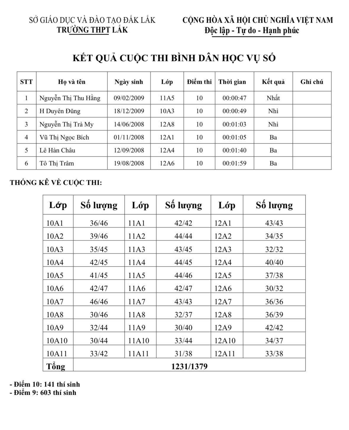 KẾT QUẢ CUỘC THI TRẮC NGHIỆM “BÌNH DÂN HỌC VỤ SỐ” – TRƯỜNG THPT LĂK