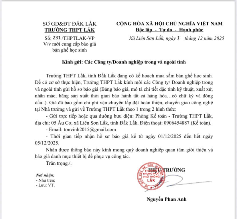 Trường THPT Lăk mời cung cấp báo giá bàn ghế học sinh.