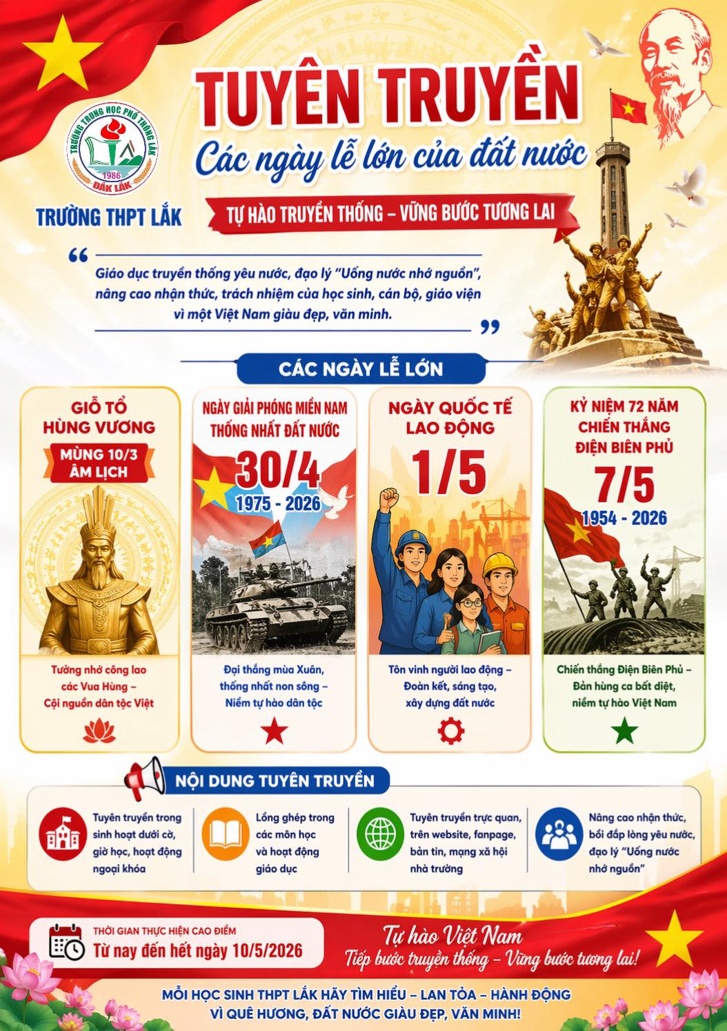 Thời gian triển khai từ nay đến hết ngày 10/5/2026, đây là khoảng thời gian để mỗi thành viên trong mái trường cùng lan tỏa những câu chuyện lịch sử ý nghĩa, biến nhận thức thành hành động, biến tự hào thành động lực học tập và rèn luyện.